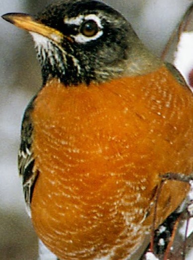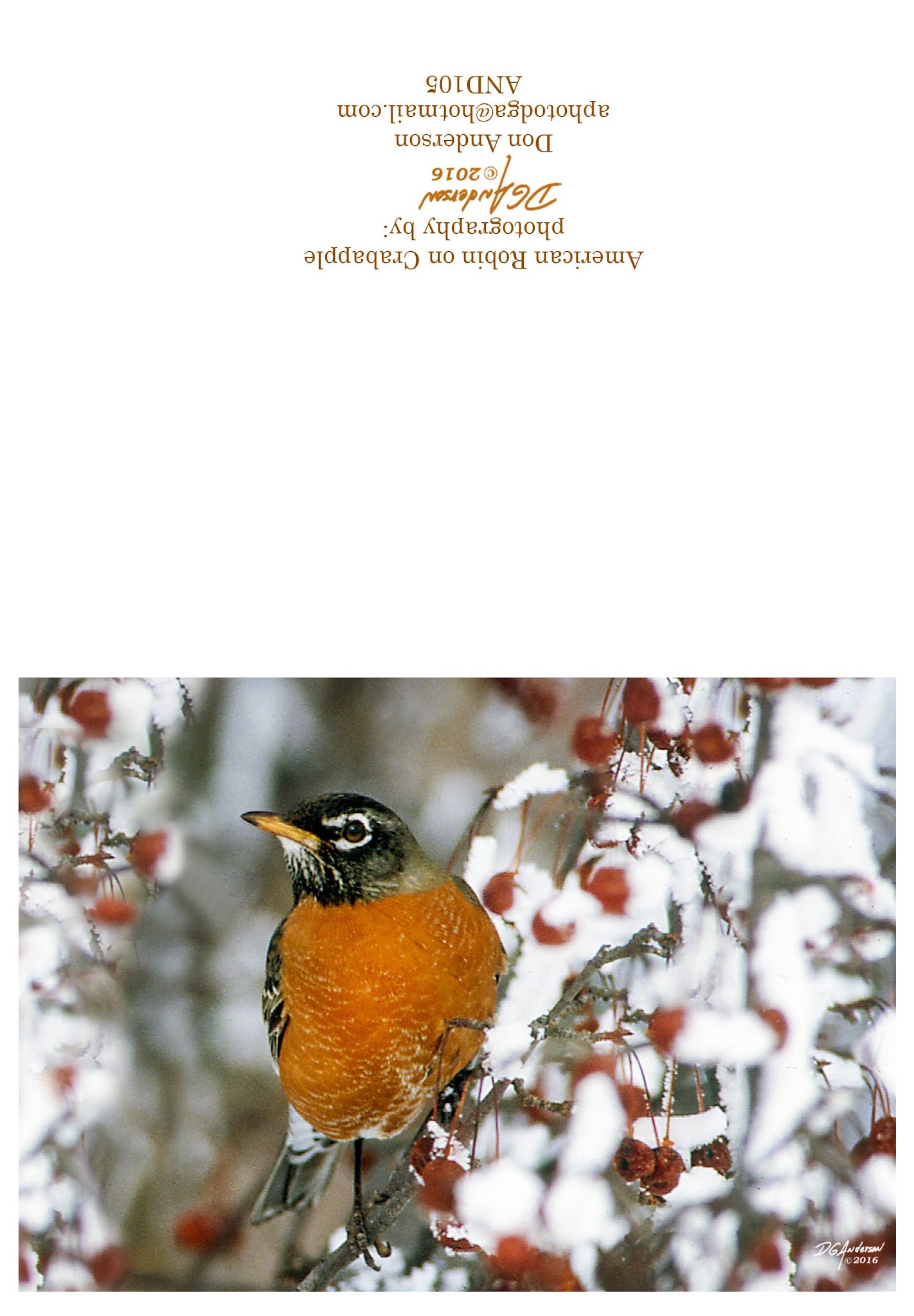 AMERICAN ROBIN ON CRABAPPLE is a photographed note card of a robin sitting on a crabapple branch in the snow by photographer Don Anderson. Don Anderson is a, mostly retired, professional portrait photographer. local artist from Rochester, MN. He has been awarded the TOP PROFESSIONAL PHOTOGRAPHER of SE Minnesota for 3 years in a row.