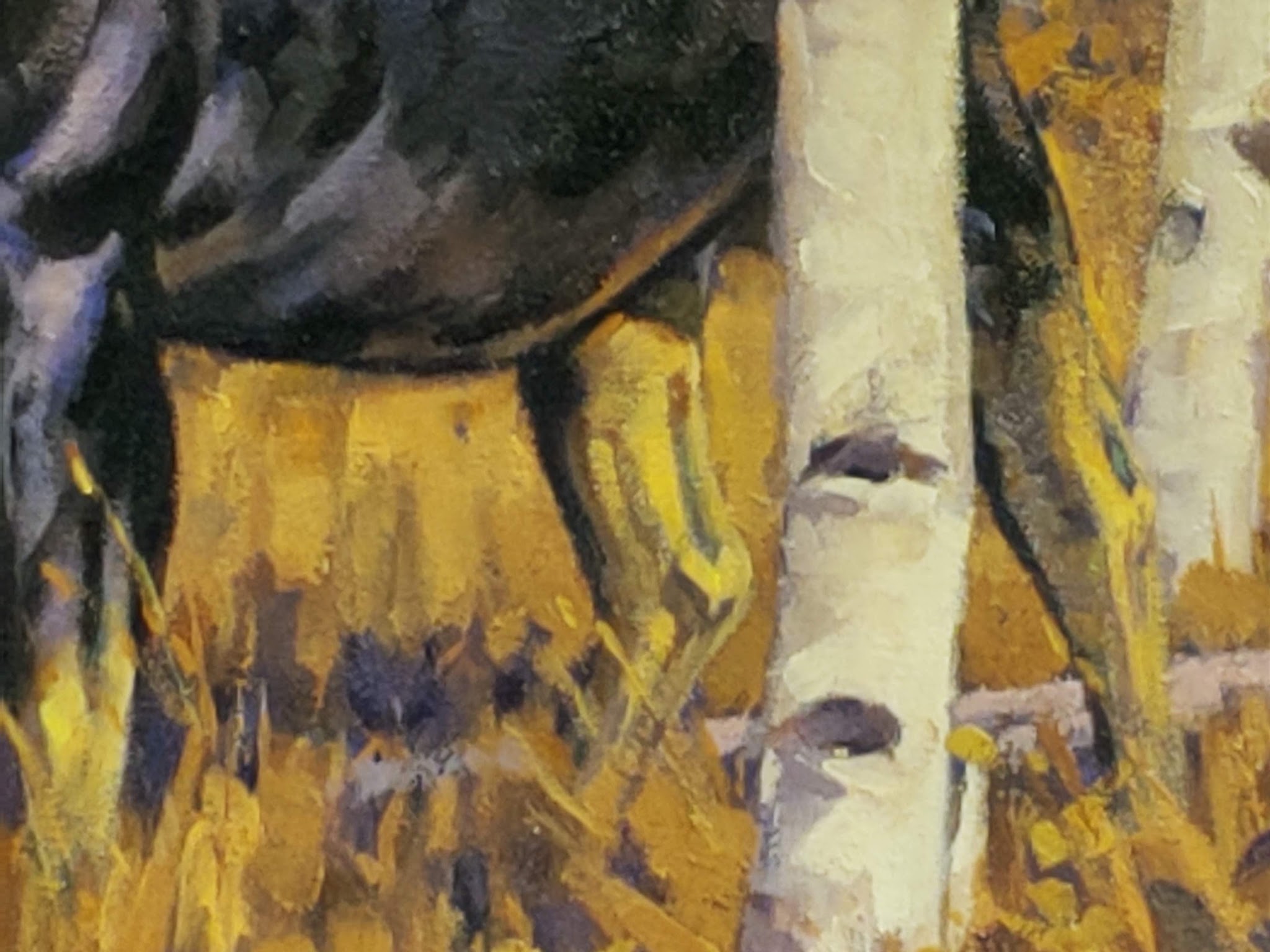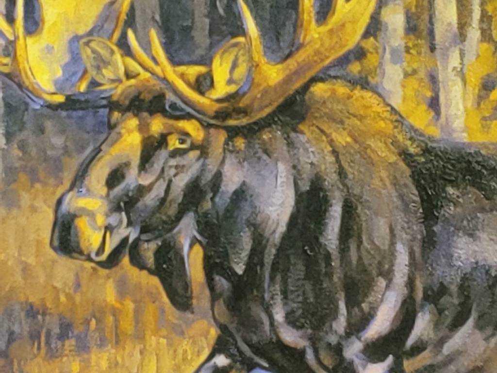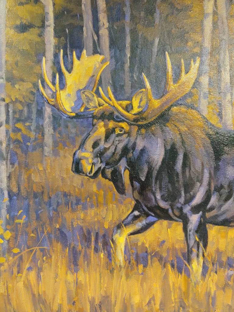 The genesis for this painting was a recent trip to Teton National Park where I photographed the late afternoon sun lighting up the aspen trees in their fall colors. After searching through my animal photo reference, I came upon this bull moose which seems to be the perfect complement of the lighter colored aspen trees.-Toni Hilscher
