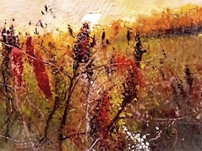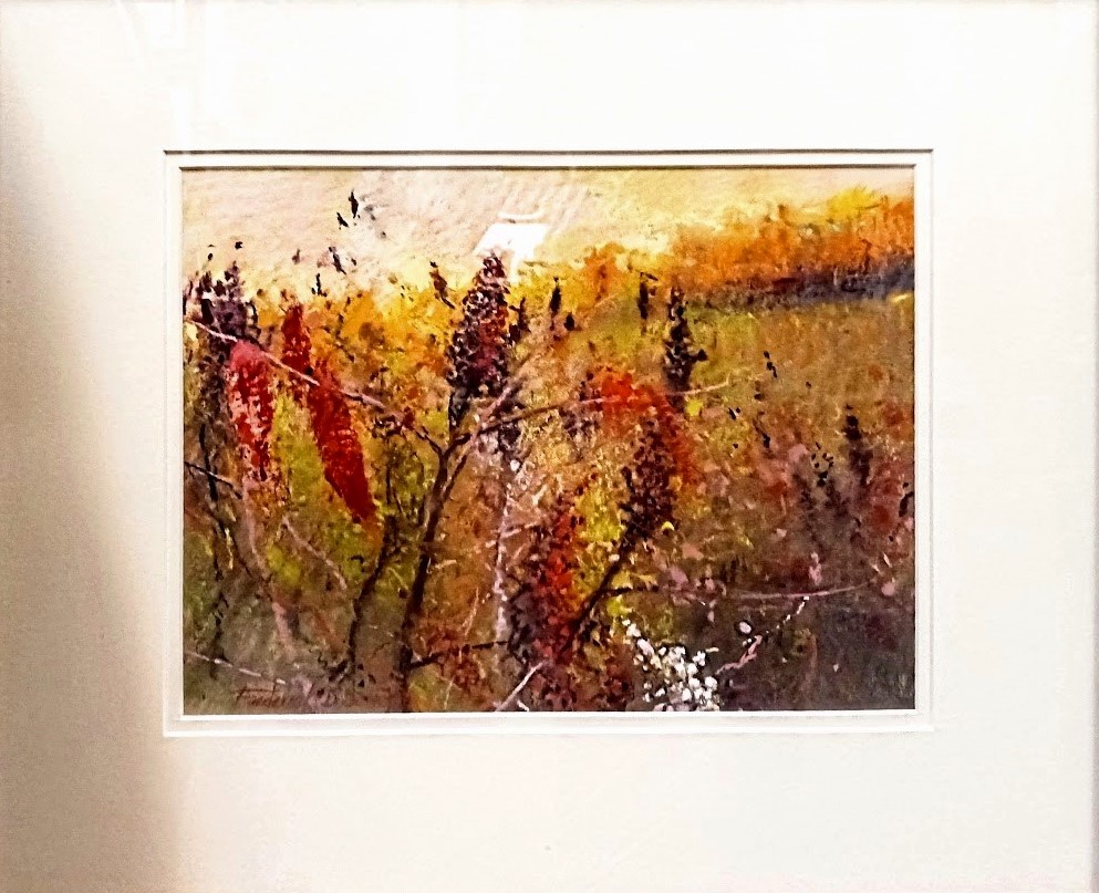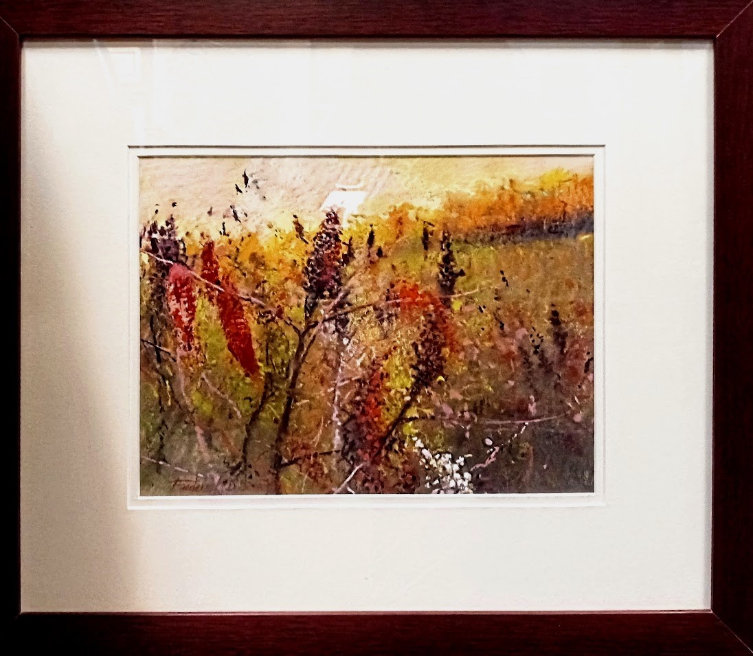SUMAC BORDERS is an original 9" x 12"- pastel painting by Minnesota artist Frederick Somers. Fred Somers has been painting full-time since 1975 at his farm-home-studio near Northfield, MN. His oil and pastel paintings, known for their peaceful sensitivity, reflect themes from the land.
