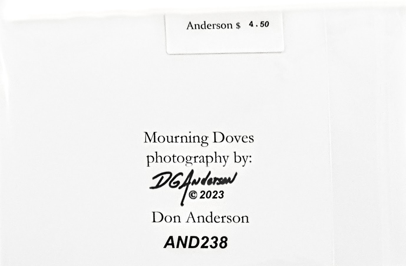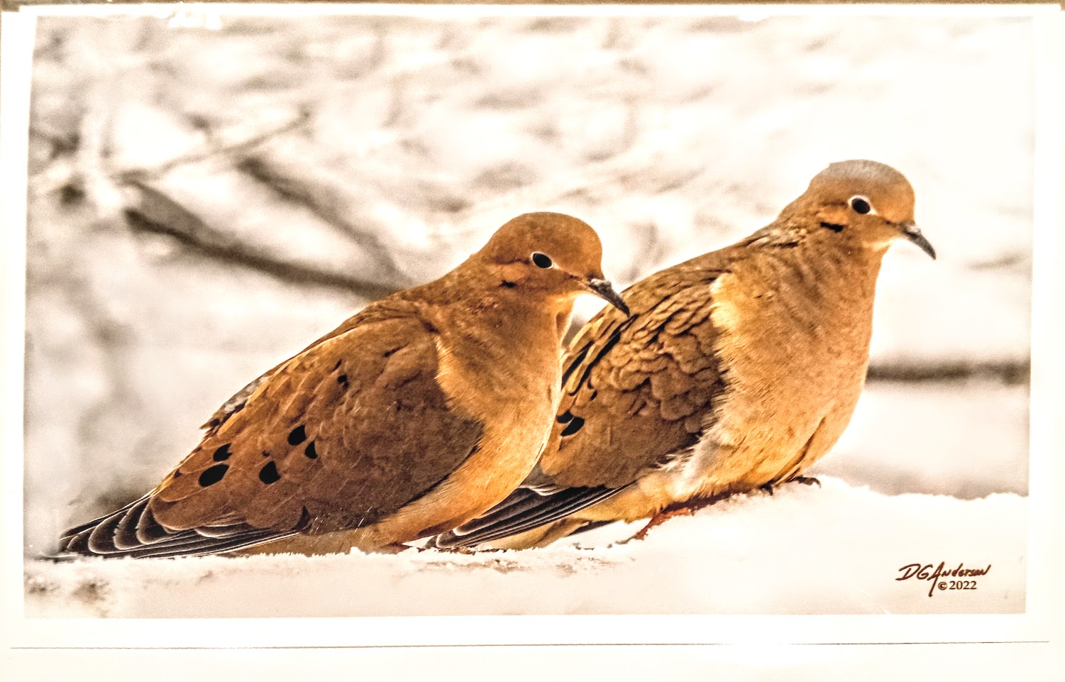 2 MOURNING DOVES is a photographed note card of 2 calm mourning doves sitting in the snow by photographer Don Anderson. Don Anderson is a, mostly retired, professional portrait photographer. local artist from Rochester, MN. He has been awarded the TOP PROFESSIONAL PHOTOGRAPHER of SE Minnesota for 3 years in a row.
