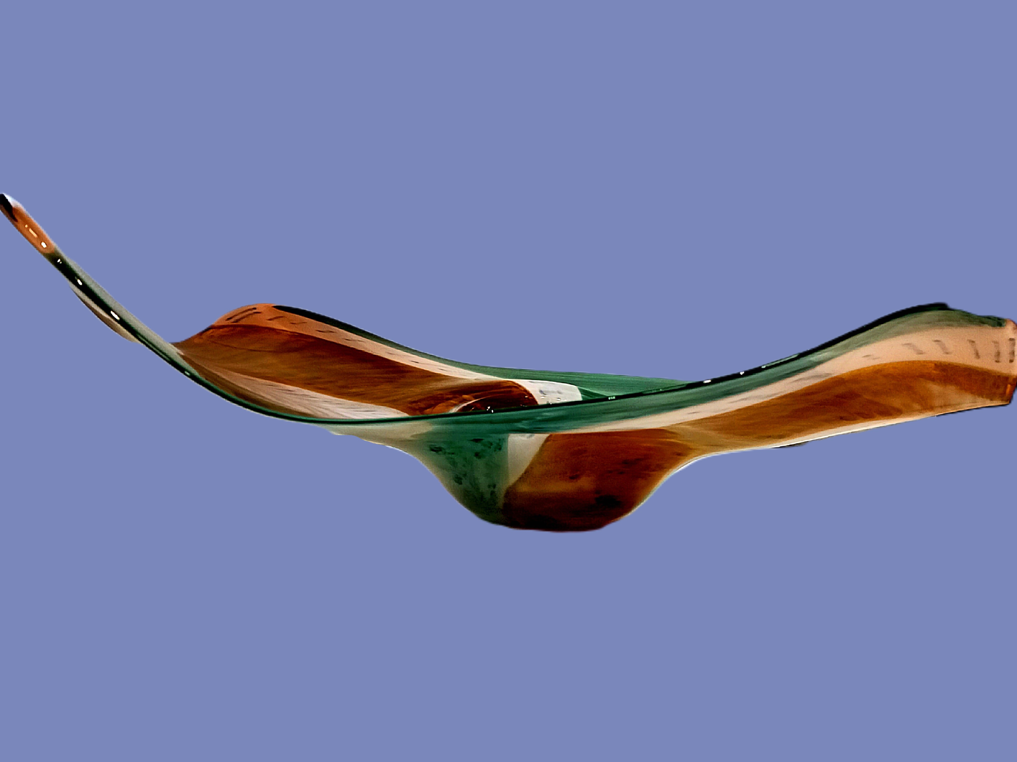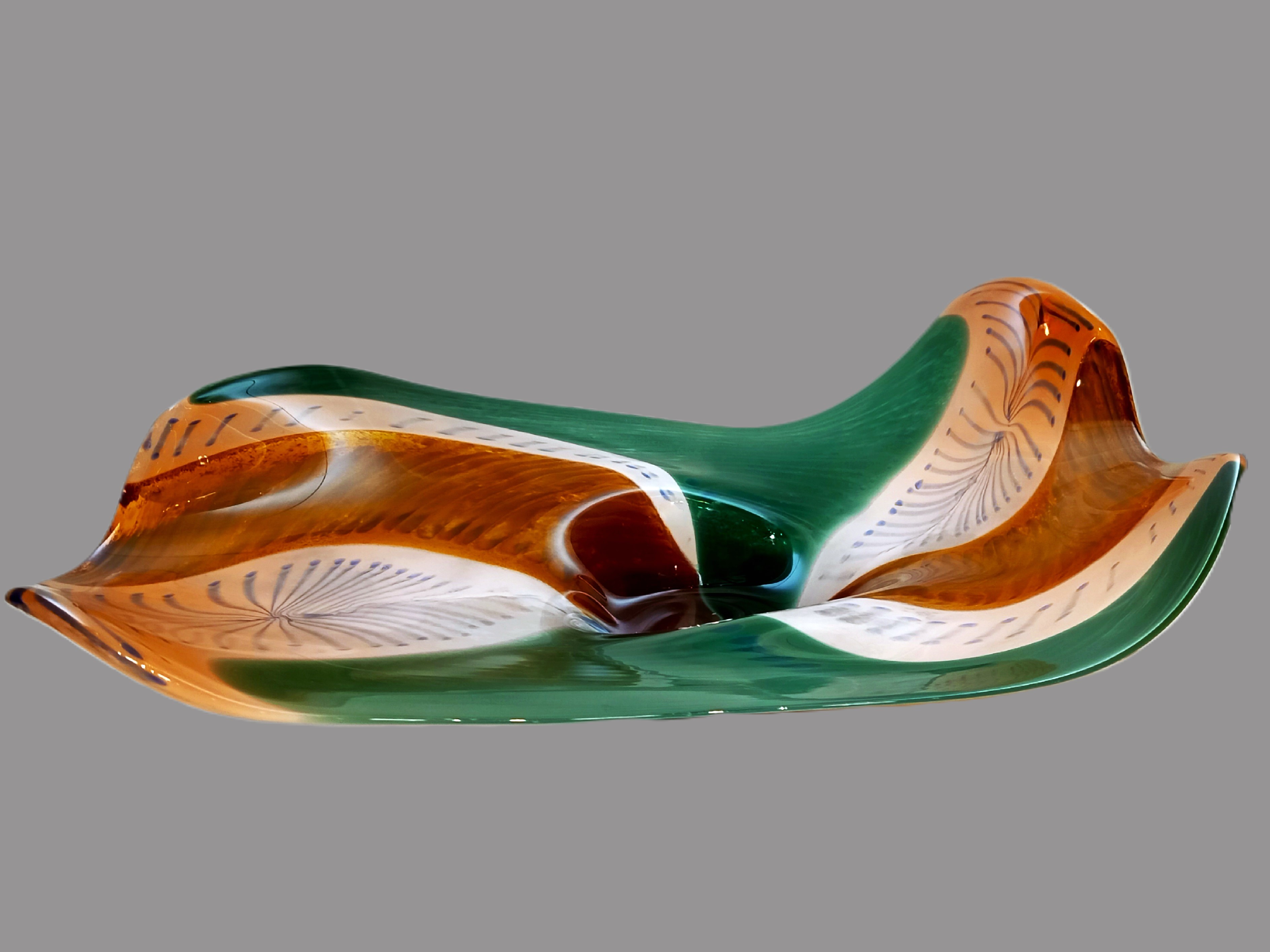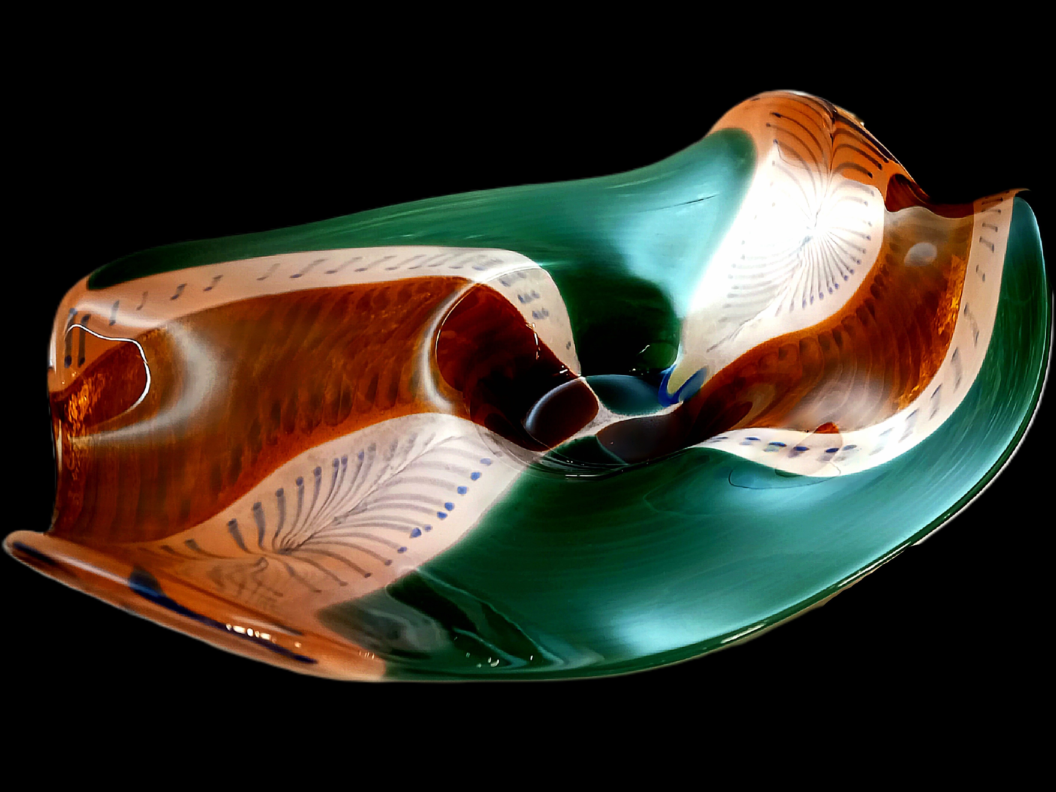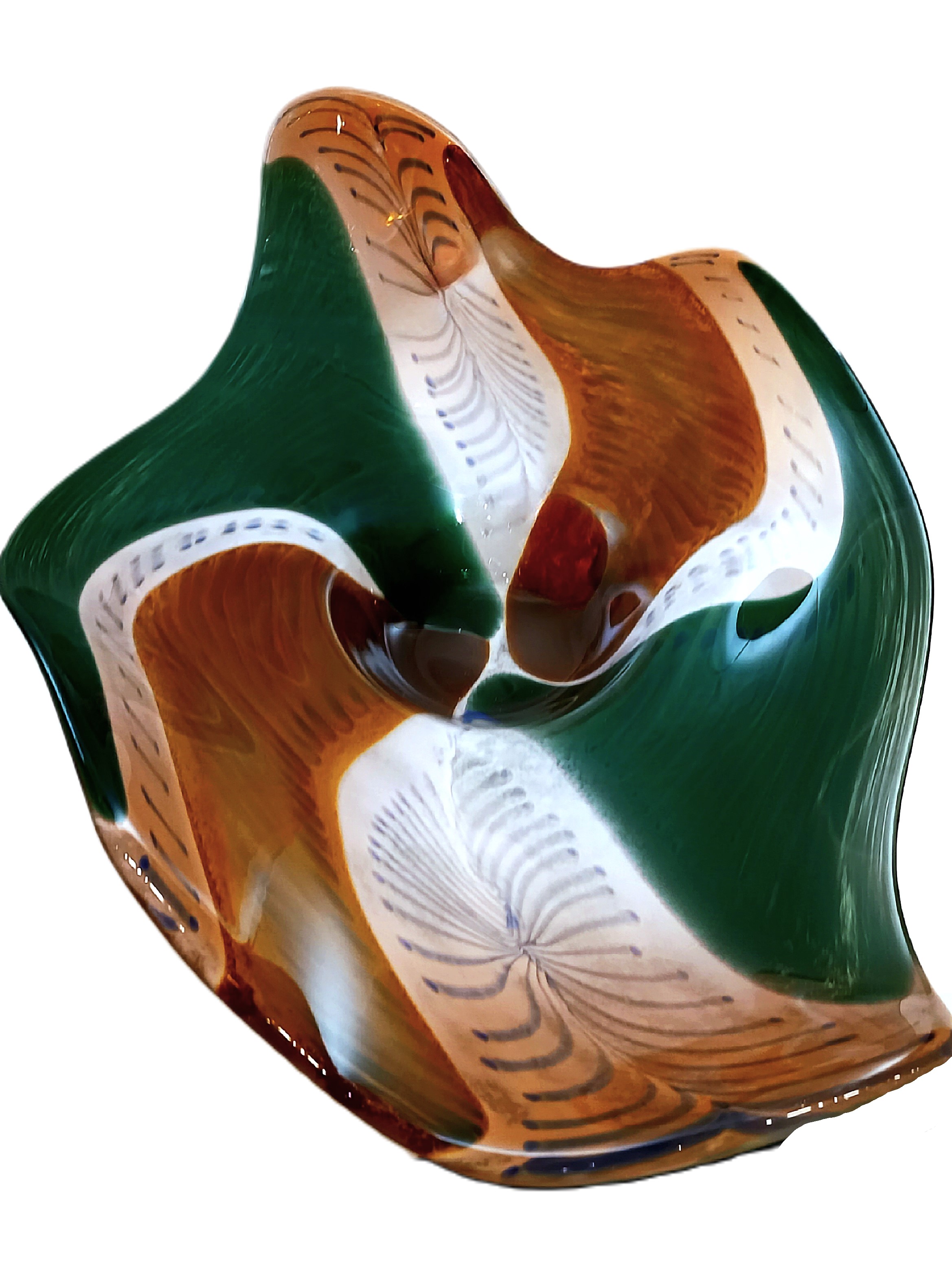 WAVY BOWL- BAND & TRAIL DESIGN (Yellow/ Green & Rust) handcrafted by local Glassblower Robinson Scott, from Anoka, Minnesota. He has been blowing glass for over 45 years. His stunning artwork has earned him many awards through his glassblowing career. “I am always influenced by the importance of simplistic designs that enhance and accentuate the depth, reflectivity and translucency that naturally occur in glass. The predictability and unpredictability of glass creates an atmosphere of discovery, learning and continual growth. This is what motivates me to further test, expand and explore my abilities.”- Robinson Scott.