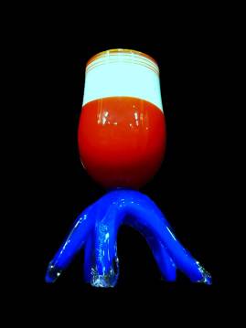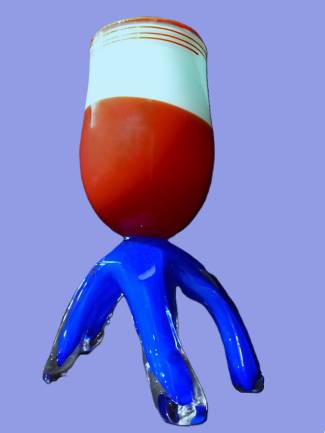 6-LEGGED GOBLET in Blue, Red & Green- handcrafted by local Glassblower Robinson Scott, from Anoka, Minnesota.  He has been blowing glass for over 45 years. His stunning artwork has earned him many awards through his glassblowing career. “I am always influenced by the importance of simplistic designs that enhance and accentuate the depth, reflectivity and translucency that naturally occur in glass. The predictability and unpredictability of glass creates an atmosphere of discovery, learning and continual growth. This is what motivates me to further test, expand and explore my abilities.”- Robinson Scott.