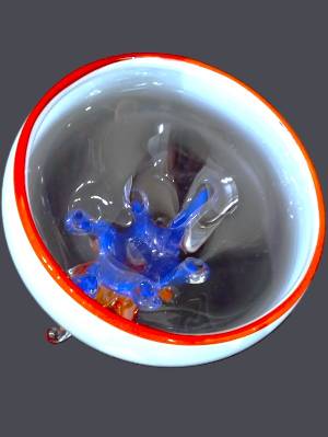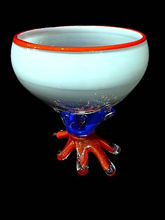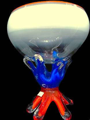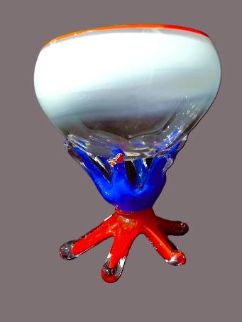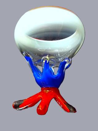 6-LEGGED BOWL in Green, Red & Blue- handcrafted by local Glassblower Robinson Scott, from Anoka, Minnesota. He has been blowing glass for over 45 years. His stunning artwork has earned him many awards through his glassblowing career. “I am always influenced by the importance of simplistic designs that enhance and accentuate the depth, reflectivity and translucency that naturally occur in glass. The predictability and unpredictability of glass creates an atmosphere of discovery, learning and continual growth. This is what motivates me to further test, expand and explore my abilities.”- Robinson Scott.