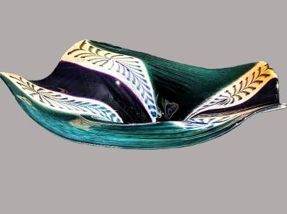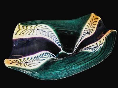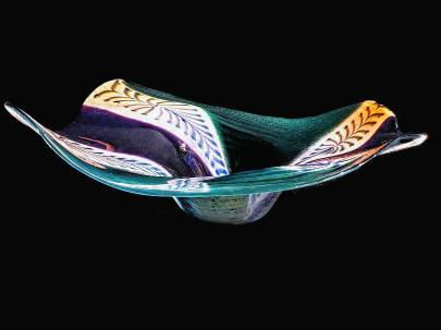 A BLUE-GREEN, PEACH & PURPLE WAVY BOWL (B&T)- handcrafted by local Glassblower Robinson Scott, from Anoka, Minnesota. He has been blowing glass for over 45 years. His stunning artwork has earned him many awards through his glassblowing career. “I am always influenced by the importance of simplistic designs that enhance and accentuate the depth, reflectivity and translucency that naturally occur in glass. The predictability and unpredictability of glass creates an atmosphere of discovery, learning and continual growth. This is what motivates me to further test, expand and explore my abilities.”- Robinson Scott.