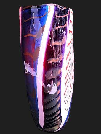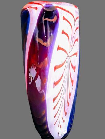 A RED, BLUE AND PURPLE VASE- "BANDED TRAIL" PATTERN - handcrafted by local Glassblower Robinson Scott, from Anoka, Minnesota. He has been blowing glass for over 45 years. His stunning artwork has earned him many awards through his glassblowing career. “I am always influenced by the importance of simplistic designs that enhance and accentuate the depth, reflectivity and translucency that naturally occur in glass. The predictability and unpredictability of glass creates an atmosphere of discovery, learning and continual growth. This is what motivates me to further test, expand and explore my abilities.”- Robinson Scott.