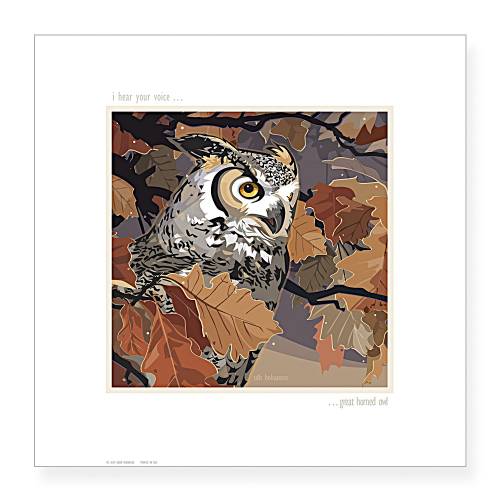 In this original illustration titled "I Hear Your Voice - Great Horned Owl" by Sandy Hokanson, a Great Horned Owl looks out from his perch amid richly colored oak leaves. Daylight is fading, night descending. She's heard the call of her mate and is about to answer. This image is available as a note card, a signed 12" x 12", or a signed 16" x 16" metal print.