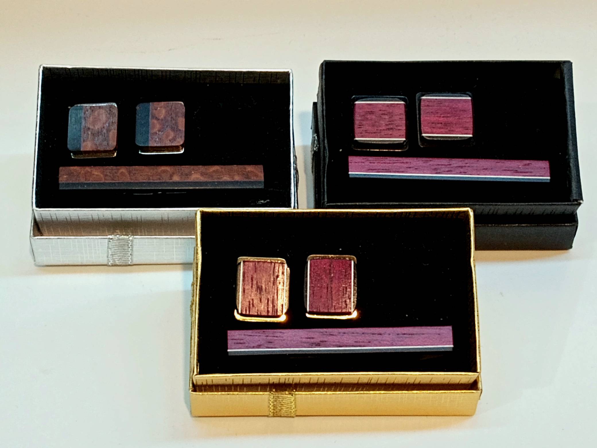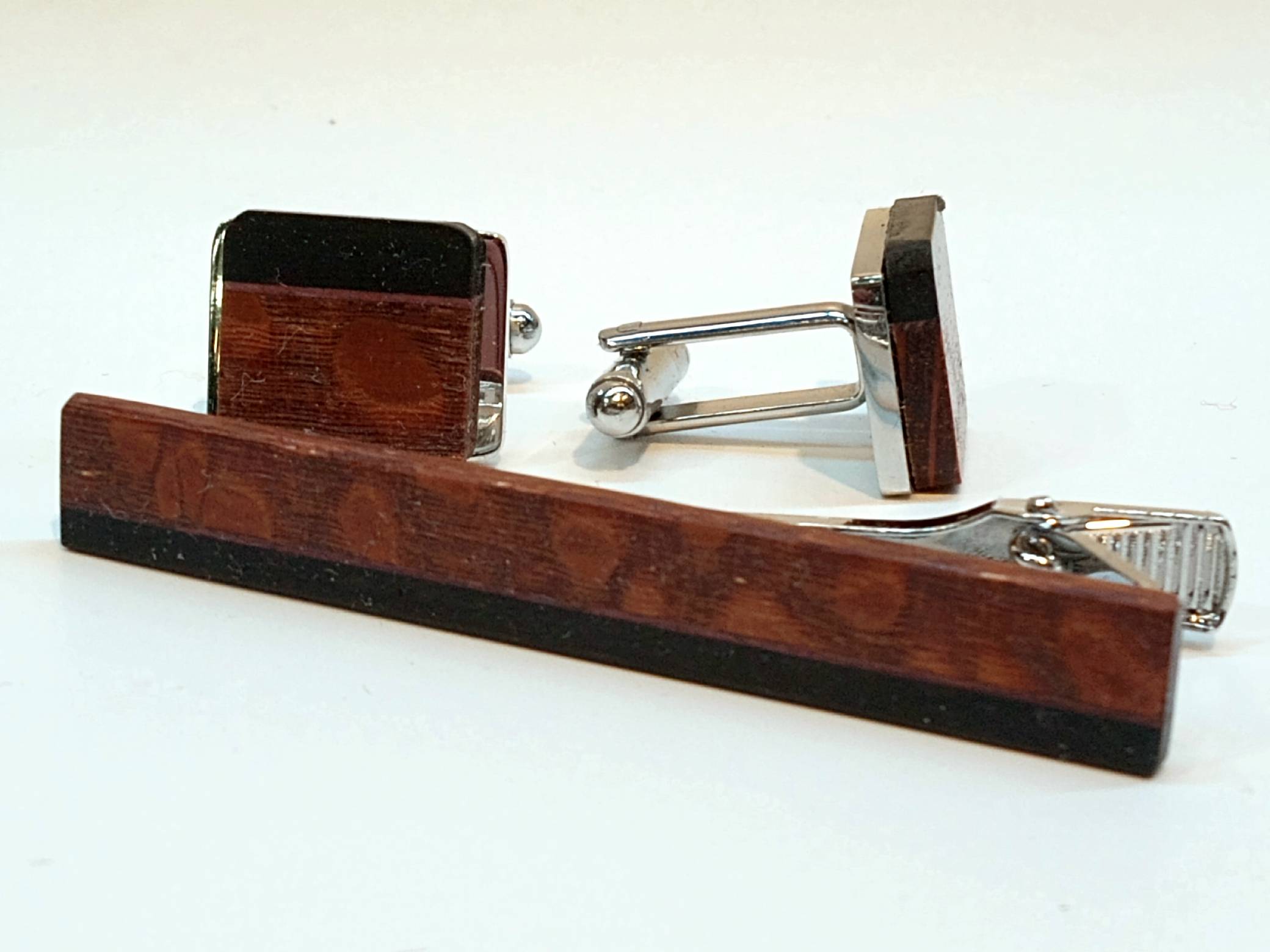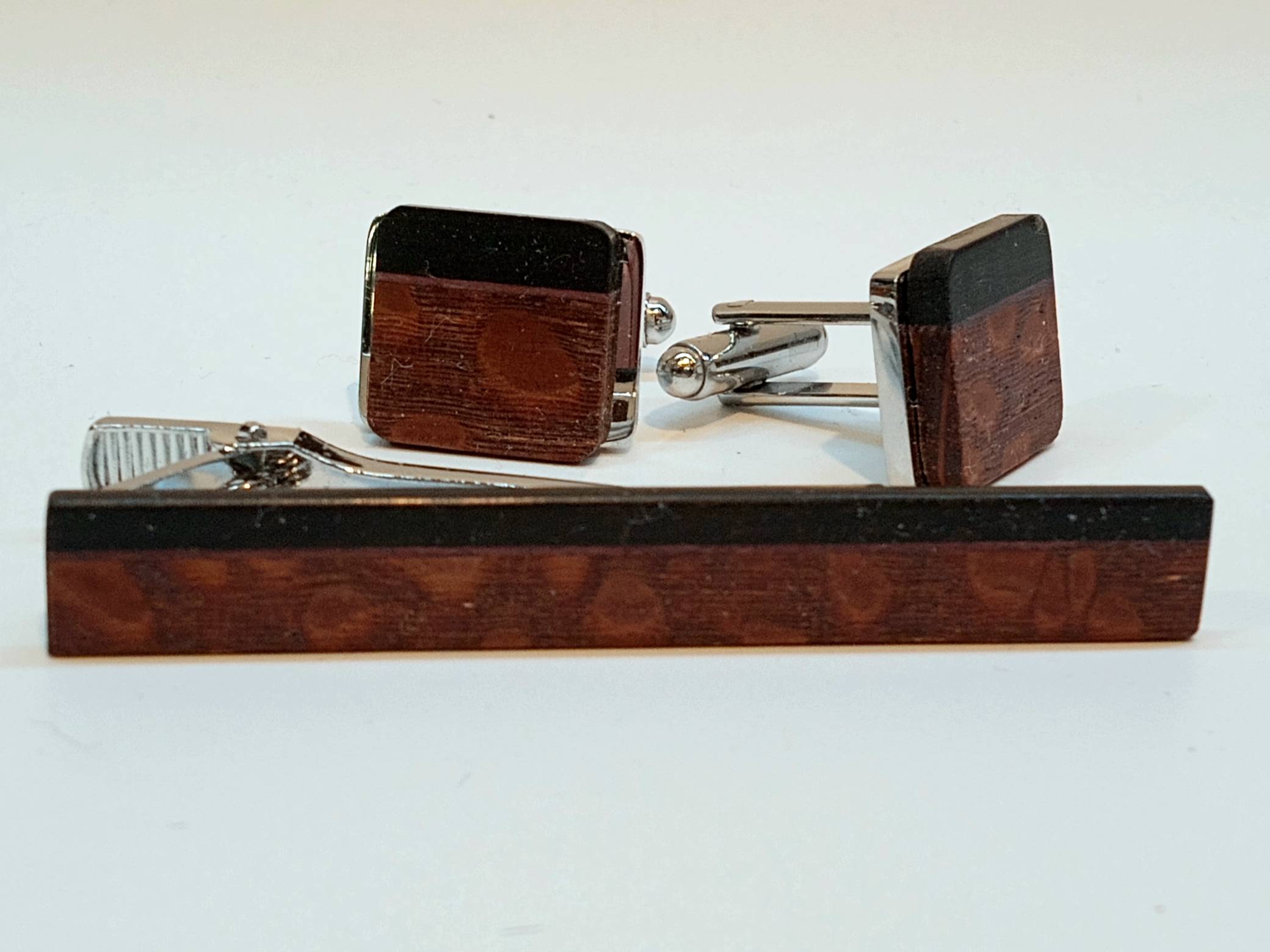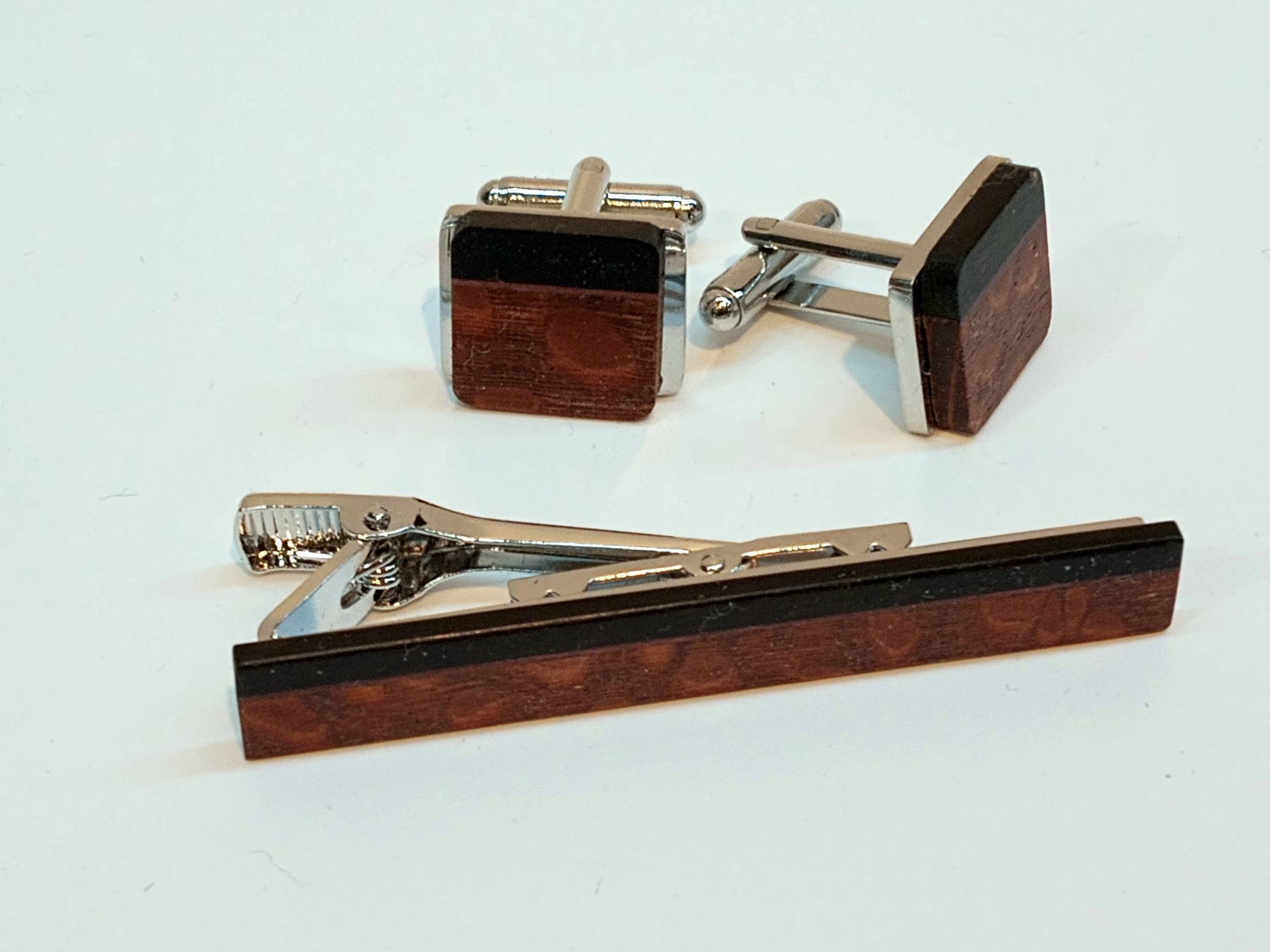 A CUFFLINK & TIE CLIP SET- Hand crafted by Rochester, MN artist Bob Cieslack, made from stainless steel and covered in domestic and exotic woods from around the world. Each different in the combination of woods used. Wooden Money Clip with abalone also available.