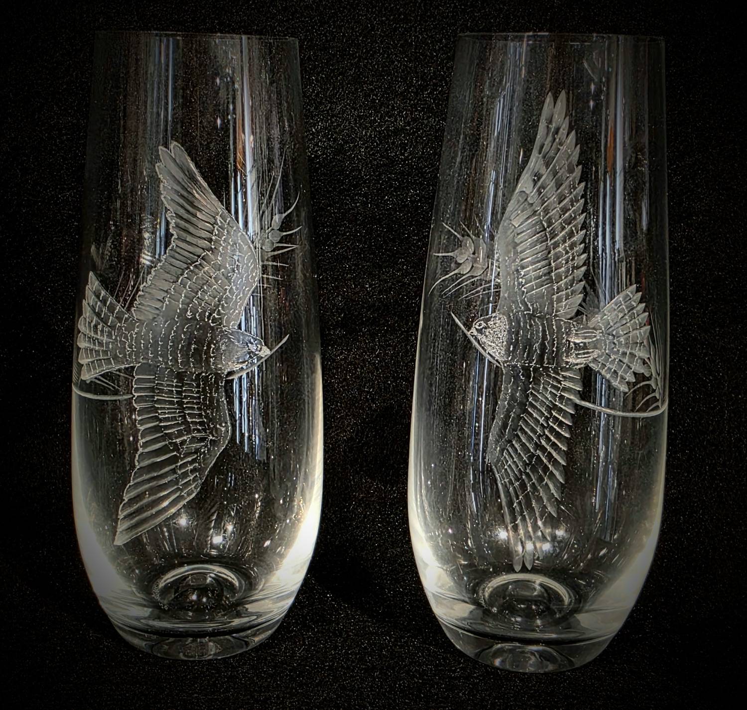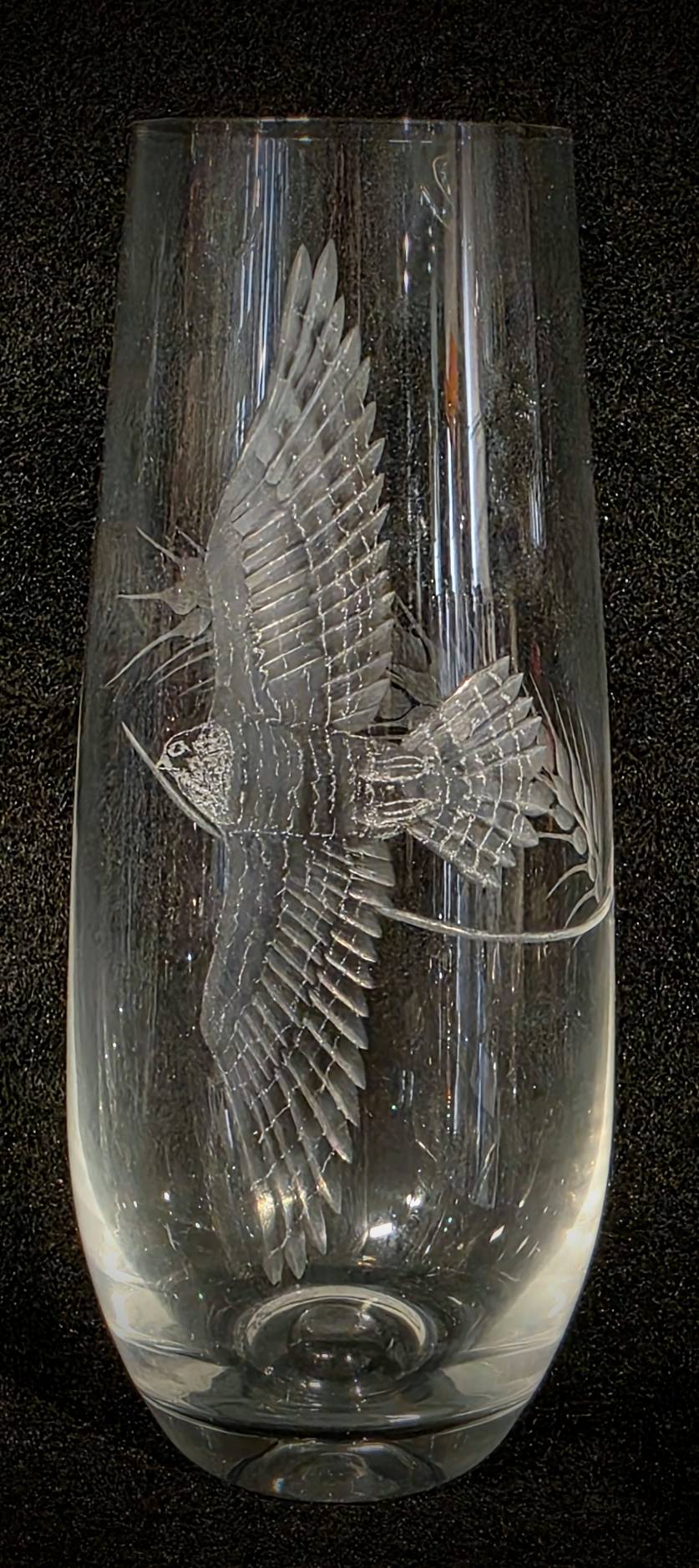 This ONE-OF-A KIND RED STEMLESS CHAMPAGNE FLUTE- PEREGRINE AND WHEAT is done by our very talented local cut-glass artist, Carl Miller.