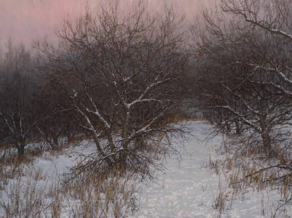 "I am a self-taught artist living and working in rural southeastern Minnesota. Working in oils and watercolour, my work is a study of place, time, and season. I love the place where I live; as familiar as the back of my hand, yet never the same two days in a row. I draw a lot of inspiration from my local area. I enjoy the challenge of plein air painting, and the way it encourages taking a closer look, to more fully take in what might otherwise go unnoticed. My plein air paintings, done outdoors on location, usually within 2 to 3 hours, attempt to capture the fleeting and changing view of a particular place and time as I see it. My studio works, supported by plein air studies, memories, emotion, and imagination, are built up through a lot of time and layers of paint and allow me to work in more detail. In all my work, I try to capture the beauty I see in the simple, everyday blessings, in faces and events, subtle and breathtaking, convinced that, "Every good gift and every perfect gift is from above, and comes down from the Father of lights, with whom there is no variation or shadow of turning." (James 1:17)" -- Hannah Heyer
