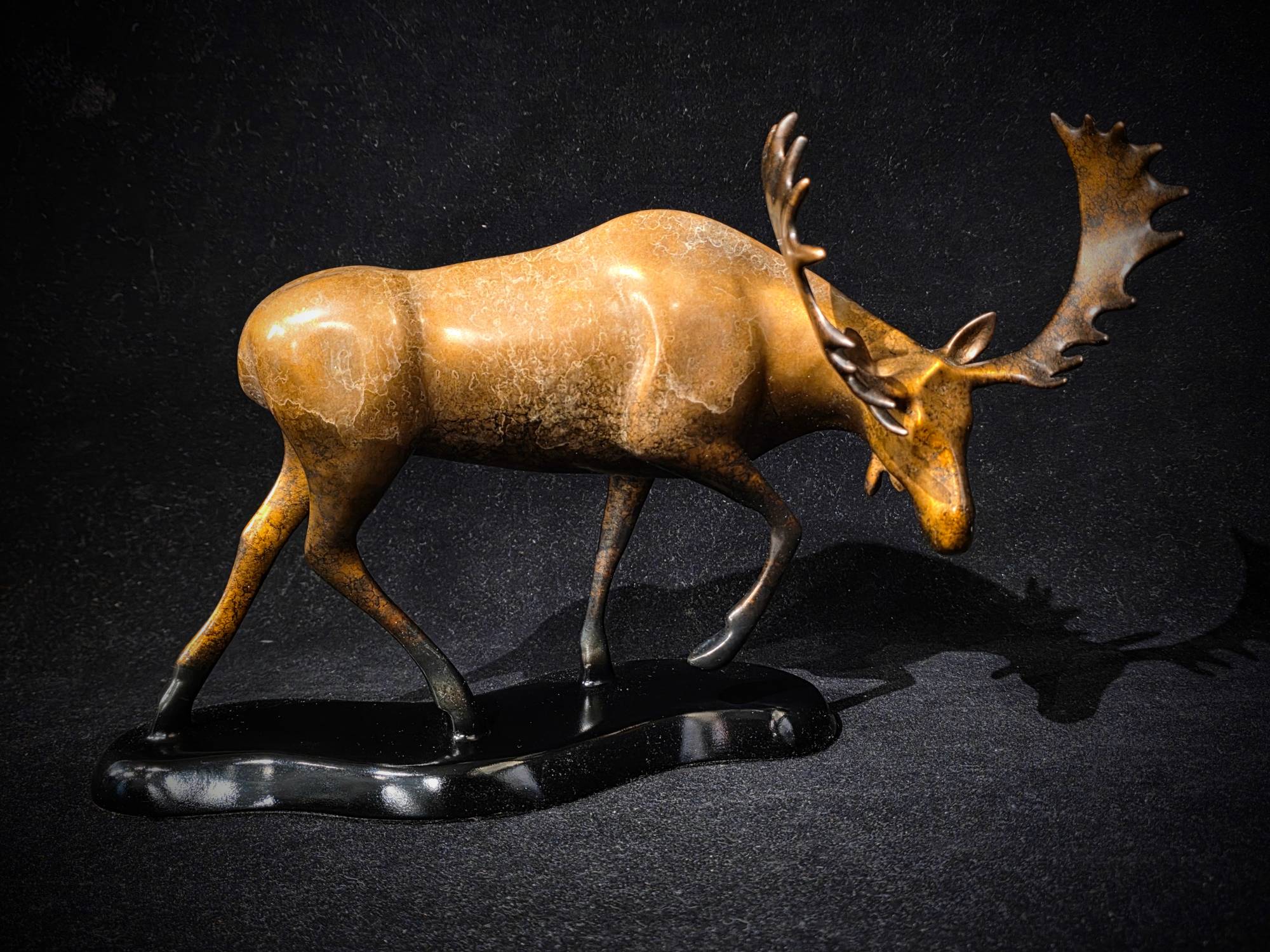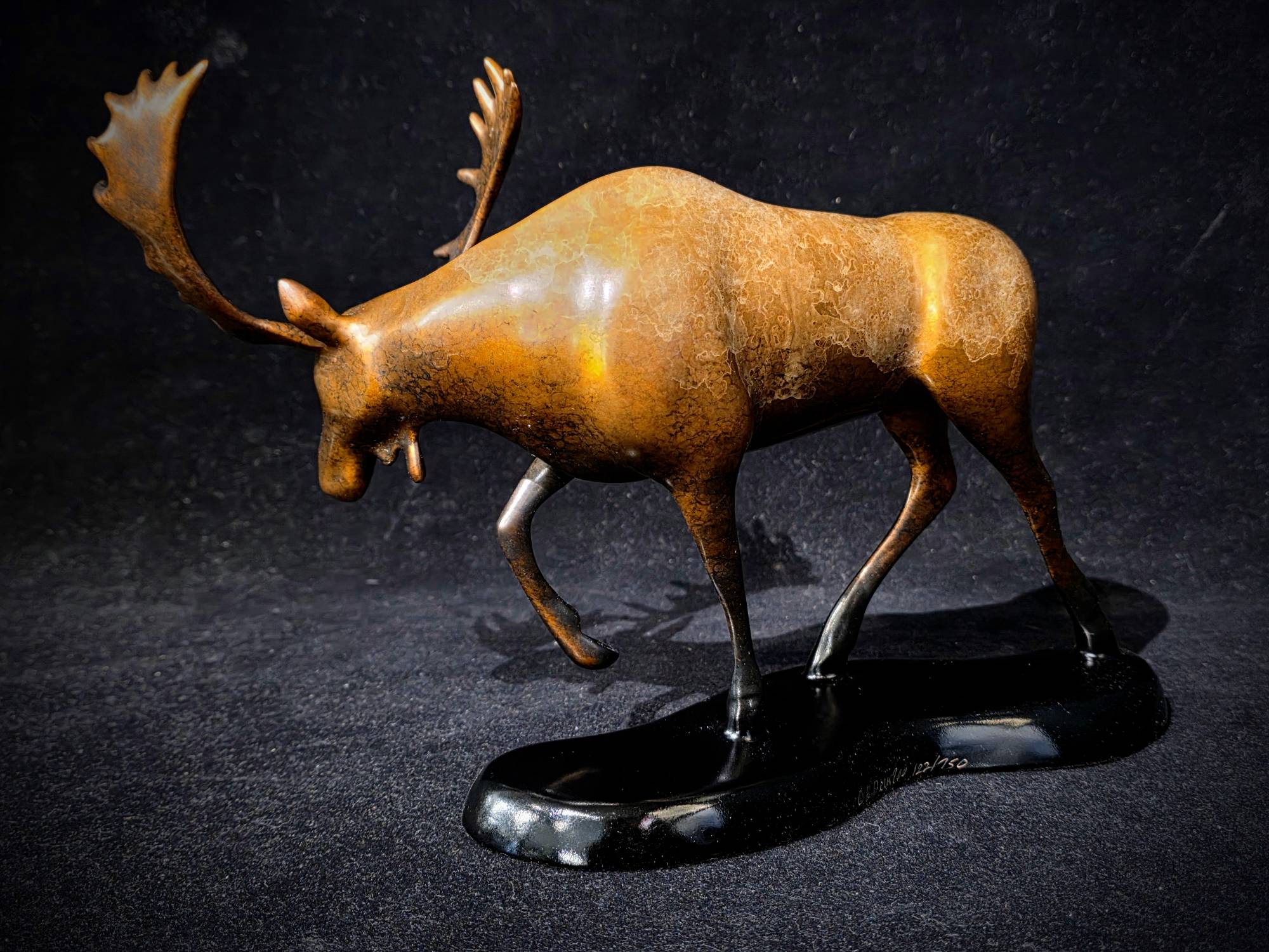 MEADOW MERAUDER - MOOSE - Bronze Sculpture (#122/ 750) by sculptor Robert Deurloo. Robert Deurloo creates exquisite bronze wildlife sculptures cast from molten bronze, but due to an elaborate and exotic patina process, they appear to be chiseled from the granite of the Sawtooth Mountains. A combination of intense heat and various acids and minerals produce the polished stone patinas.