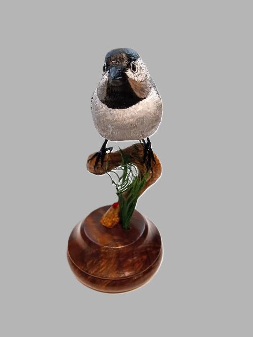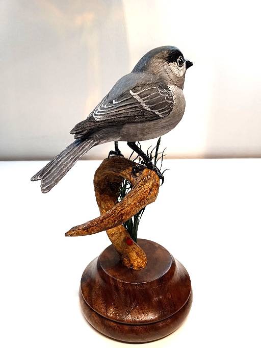 A CHICKADEE carving by wood carver Harold Rosauer from Iowa. Harold Rosauer has carved 993 lifelike birds, taking up to 900 hours to finish one. He has carved 40,000 wooden bird feather pins, so lifelike you’d think a slight breeze could carry them away.