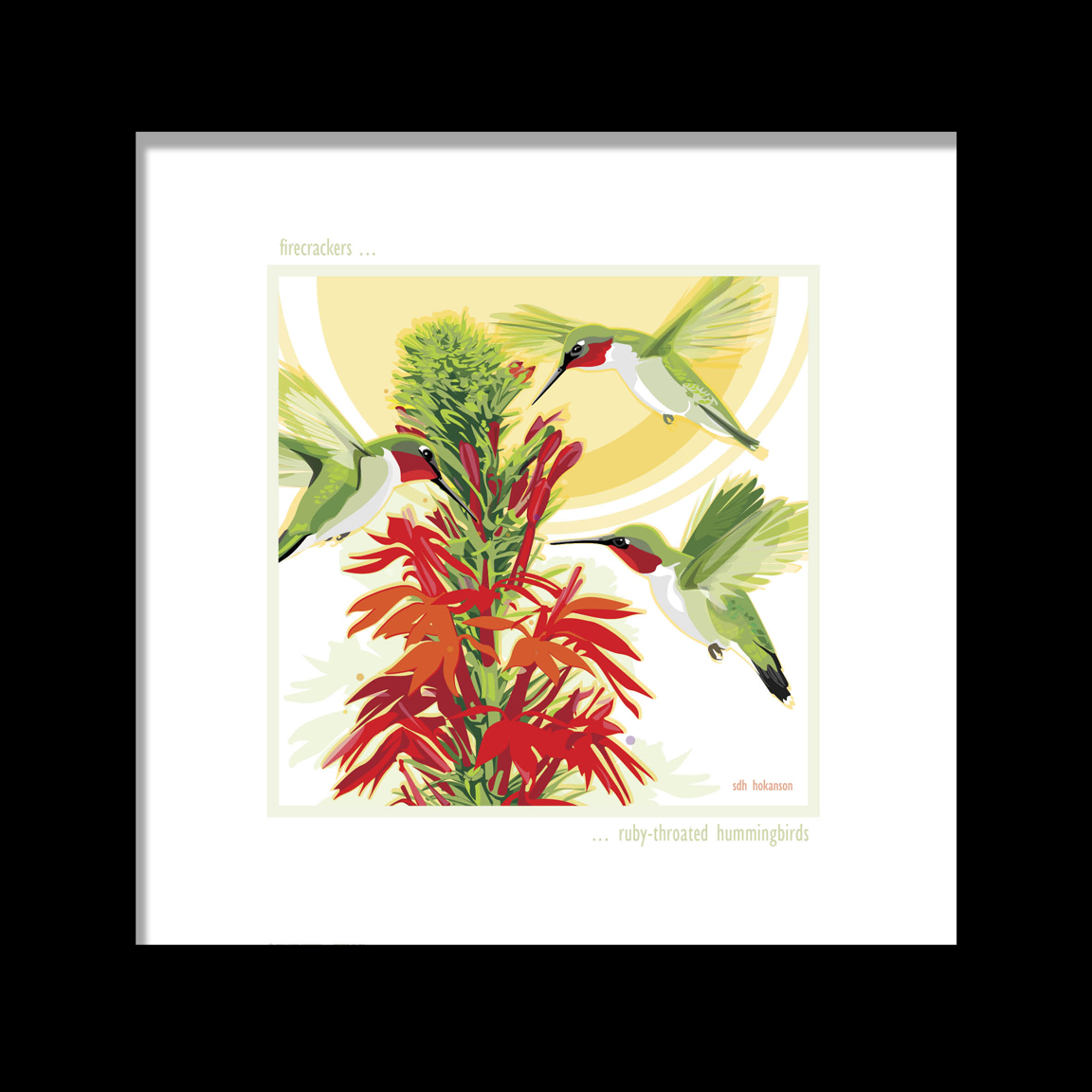 In this original illustration titled "FIRECRACKERS - HUMMINGBIRDS" by Sandy Hokanson, 3 Ruby-throated hummingbirds circle around a brilliant cardinal flower. They look like firecrackers whizzing about the sky in bursts of red and green. This image is available as a note card (blank inside), a signed 12" x 12" shrink-wrapped print, a framed print (black frame) or a 16" x 16" signed metal print.