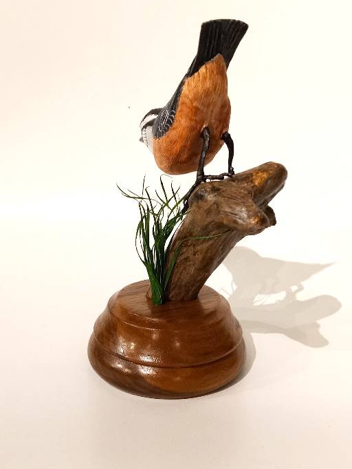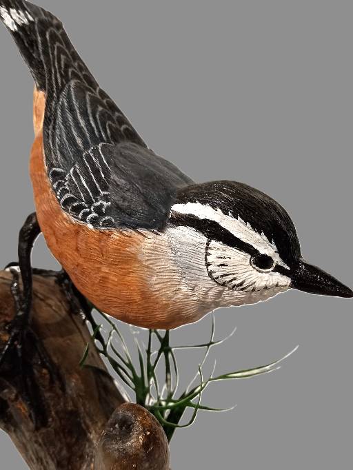 A RED-BREASTED NUTHATCH carving by wood carver Harold Rosauer from Iowa. Harold Rosauer has carved 993 lifelike birds, taking up to 900 hours to finish one. He has carved 40,000 wooden bird feather pins, so lifelike you’d think a slight breeze could carry them away.