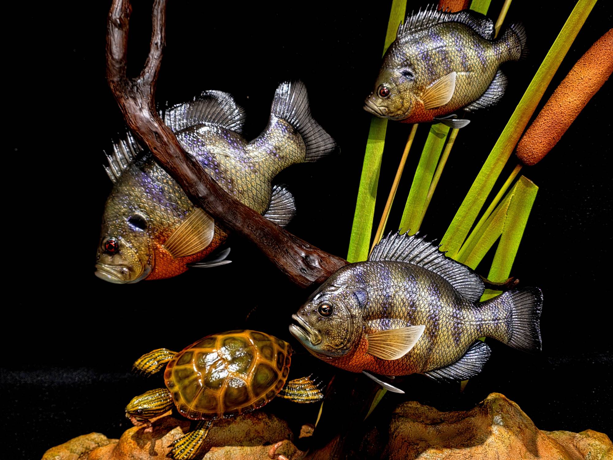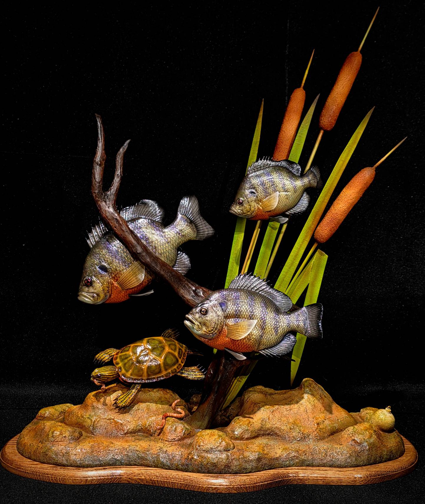 Blue Gills & Sunfish and Turtle carved out of basswood by Kyle Sherod. Dimensions: 32"(H) x 28"(W) x 12"(D). An active fisherman himself, Kyle has a great appreciation for the fish and water life he carves. A bit of a story teller in wood there is always more to his work then first meets your eye.