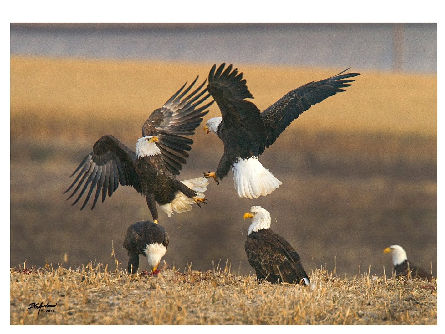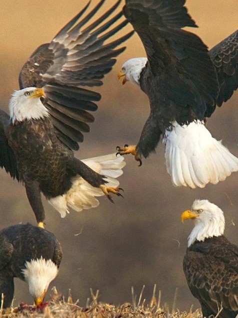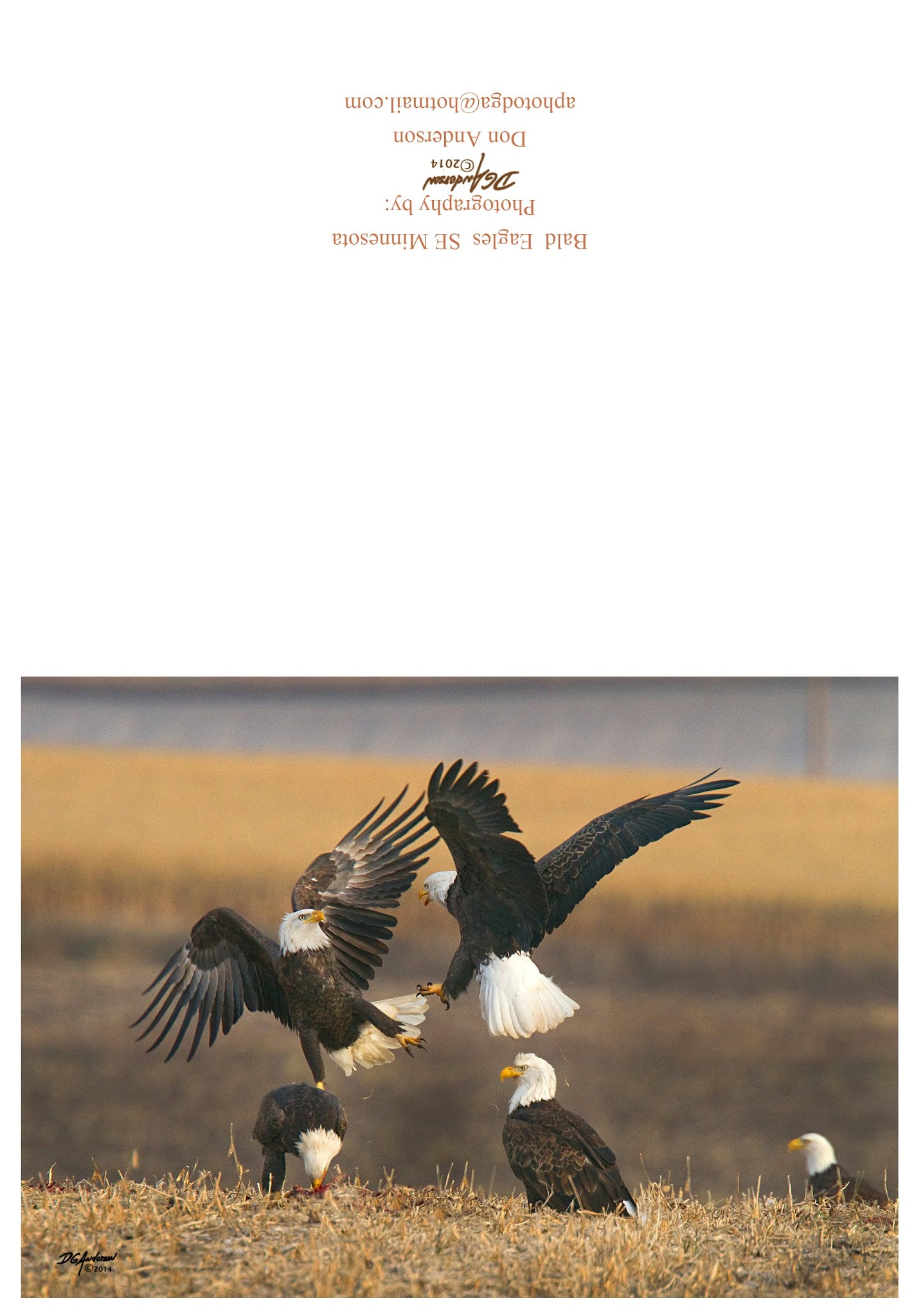 4-BALD EAGLES- SE MINNESOTA Is a note card with a photograph of a few bald eagles with 2 of them 'fighting' by Don Anderson. Don Anderson is a,  mostly retired local professional portrait photographer from Rochester,  MN. He has been awarded the TOP PROFESSIONAL PHOTOGRAPHER of SE Minnesota for 3 years in a row.