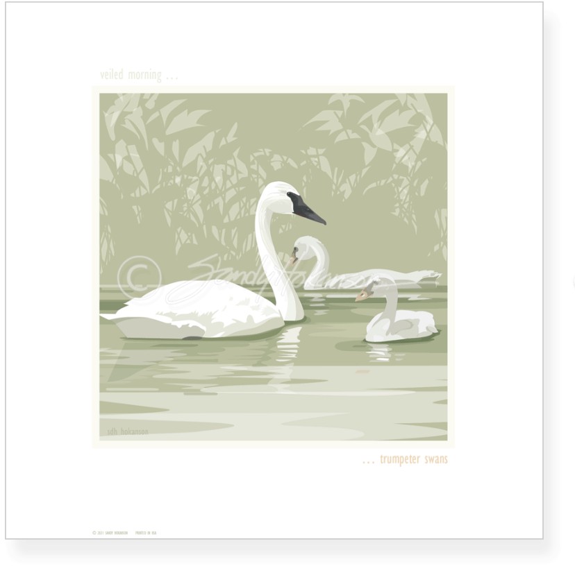 VEILED MORNING...TRUMPETER SWANS: 12" X 12" Signed Print by Sandy Hokanson. This image is available as a note card, a 12" x 12" framed print or a 16" x 16" metal print.