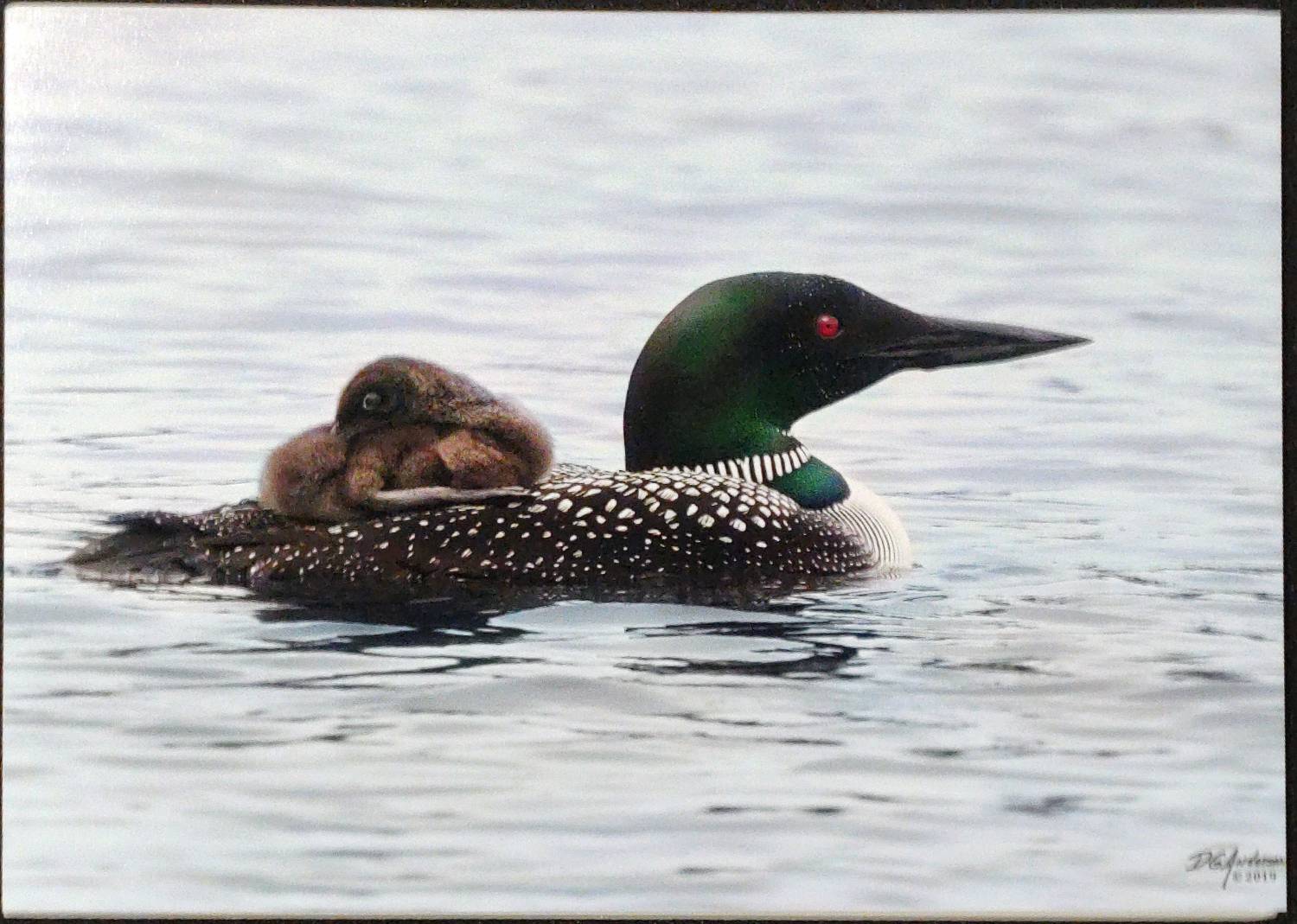 LOON AND BABYis an 11" x 14" matted print of a loon sitting in calm water with a baby on its back by photographer Don Anderson. Don Anderson is a, mostly retired, professional portrait photographer. local artist from Rochester, MN. He has been awarded the TOP PROFESSIONAL PHOTOGRAPHER of SE Minnesota for 3 years in a row.