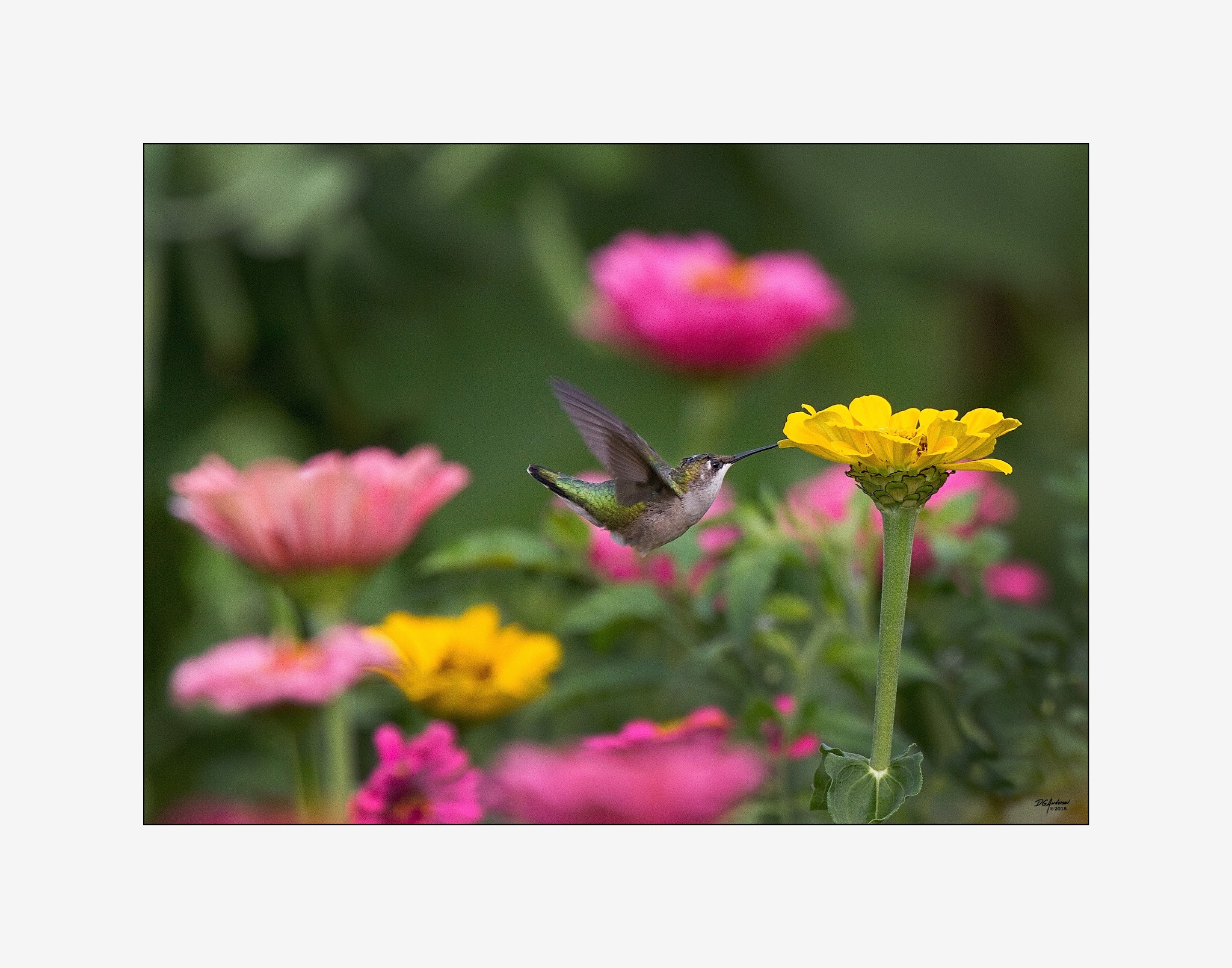 Don Anderson Print: Hummingbird with Yellow and Pink Flowers