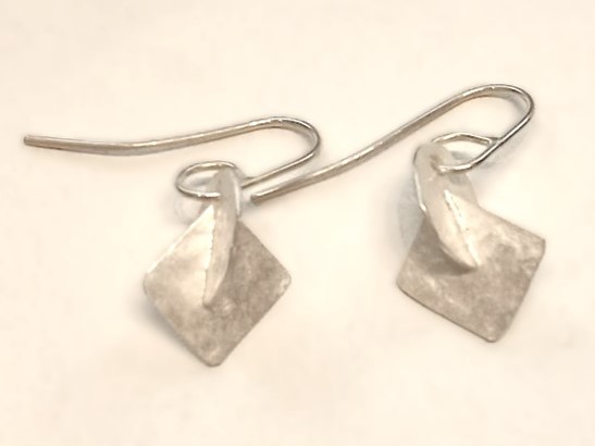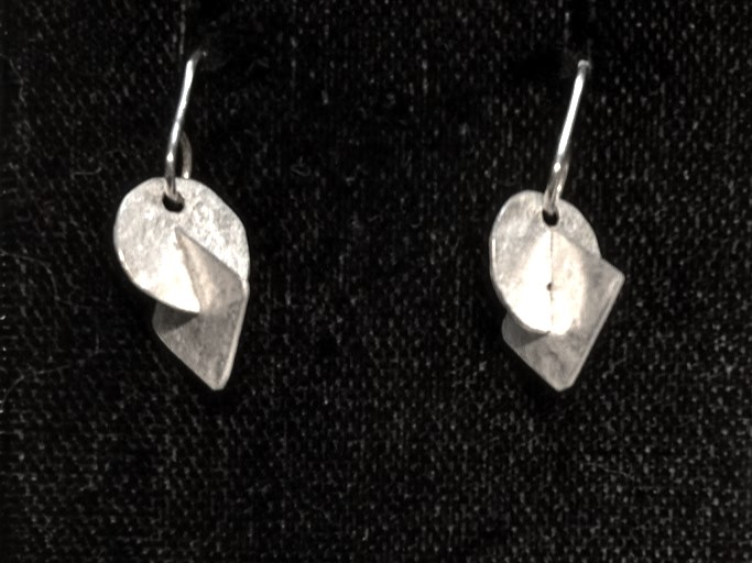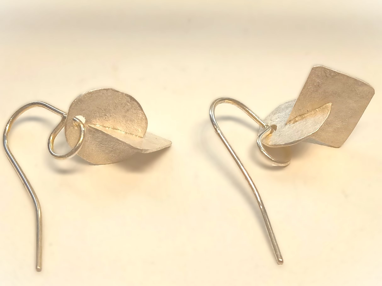 Small sterling siver interlocking square/circle earrings by Minneapolis Jeweler Brenna Klassen-Glanzer. Brenna is a second generation silversmith, born and raised in Minneapolis, MN. She uses sheet silver and copper to create contemporary jewelry. "To achieve my forms, I saw, hammer, fold, solder, texture, and bend pieces I make from sheet silver and copper, incorporating silver wire, tube and bezel when needed. I strive to make voluminous, light weight contemporary jewelry"-- Brenna