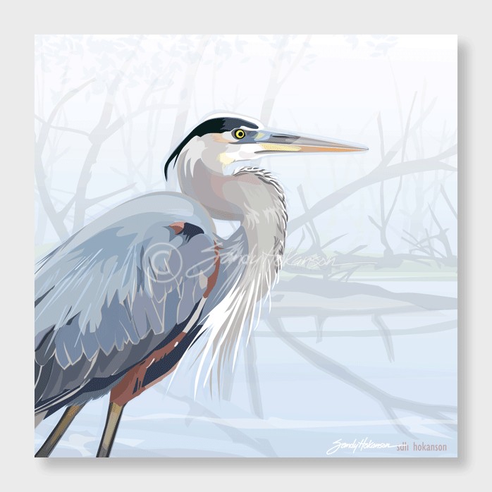 An original illustration titled "HIDDEN CREEK- GREAT BLUE HERON"- (20" x 20"- Metal Print) by local artist Sandy Hokanson. This image is available as a note card, a signed 12" x 12" shrink-wrapped print (also available framed) or as a (16" x 16") or (20" x 20") signed metal print