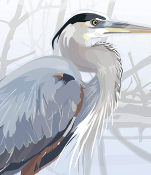 Sandy: "For many years I painted in a realistic style using acrylics or watercolors.  Now I prefer the challenge of focusing less on every feather and more on creating a clean design of each bird." "Some of my finished works are created by making detailed drawing using permanent inks which are then scanned into my computer. Others are hand drawn directly into the computer using either a mouse or a special pen and pad.  Next I'll create a unique palette of colors to layer over the drawings.  Each color is a separate layer - which means some pieces can have up to 25 layers or more. The end result is a crisp, graphic illustration."