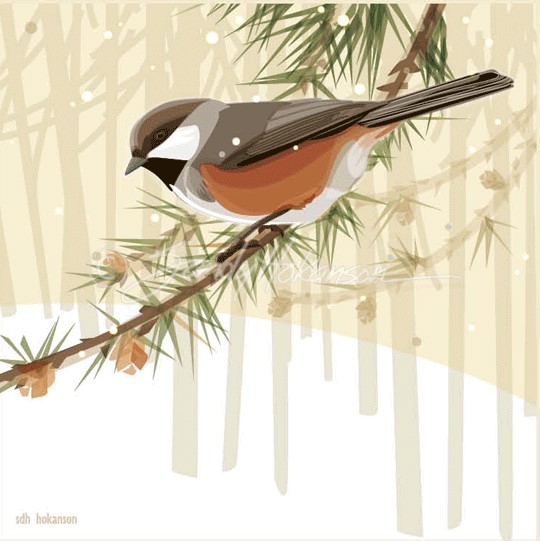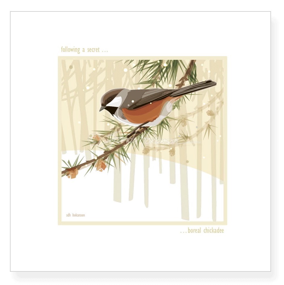 FOLLOWING A SECRET...BOREAL CHICKADEE- 12"x 12" Paper Print- by Rochester artist Sandy Hokanson. This image is also available as a note card, a 12" x 12" framed print, or a 16" x 16" metal print.