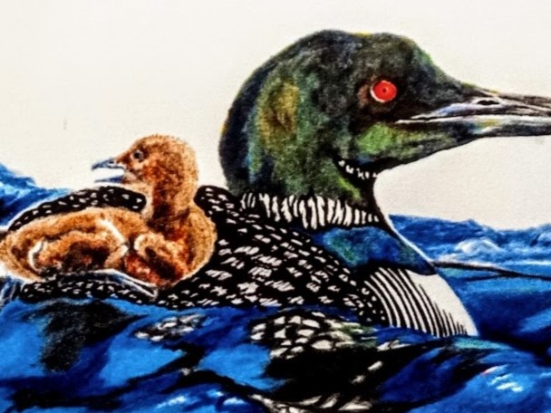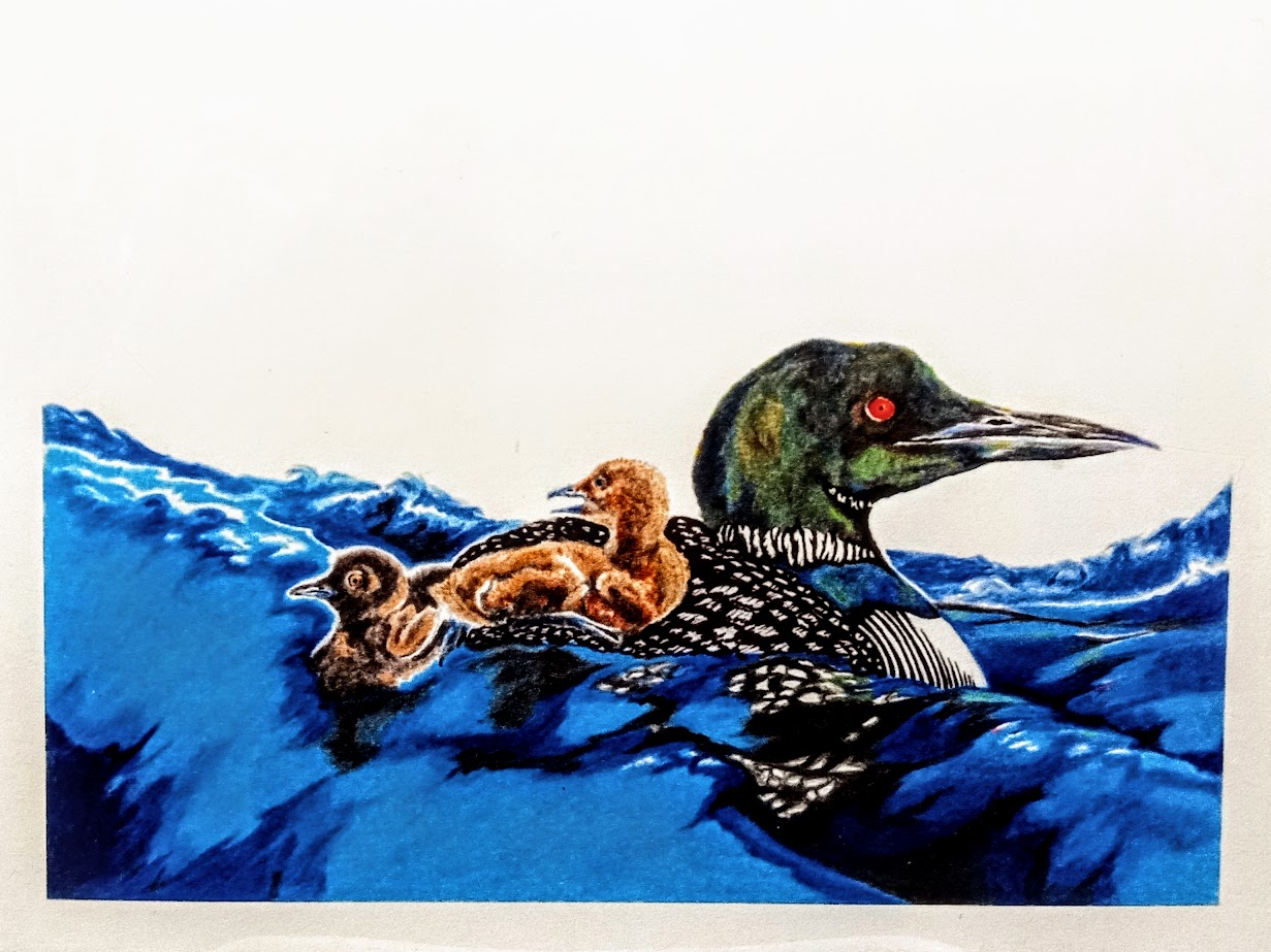 ROUGH WATER- (FEMALE LOON & HER YOUNG)-- (Note Card) is done by Wisconsin Artist Daryl Skrupky. New to the gallery, he has a strong biology background, with works in colored pencil depicting the wildlife of the upper midwest. He works in various artforms, we carry his cards reproduced from some of his original colored pencil drawings.