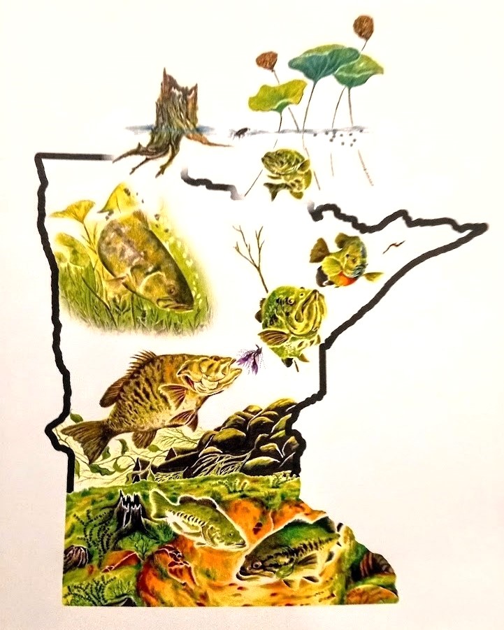 SMALL MOUTH BASS & LARGE MOUTH BASS OF MINNESOTA (Note Card) is done by Wisconsin Artist Daryl Skrupky. New to the gallery, he has a strong biology background, with works in colored pencil depicting the wildlife of the upper midwest. He works in various artforms, we carry his cards reproduced from some of his original colored pencil drawings.