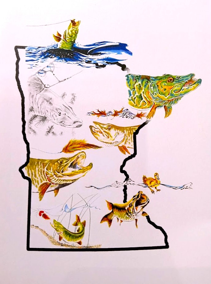 MUSKIES OF MINNESOTA (Note Card) is done by Wisconsin Artist Daryl Skrupky. New to the gallery, he has a strong biology background, with works in colored pencil depicting the wildlife of the upper midwest. He works in various artforms, we carry his cards-- reproduced from some of his original colored pencil drawings.