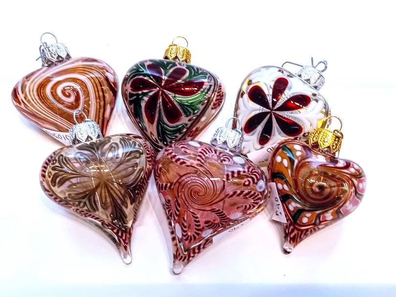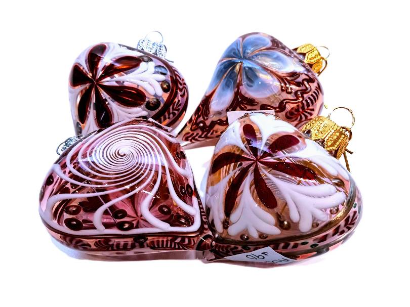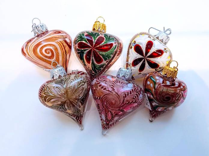 GLASS BLOWN HEART ORNAMENTS by Rochester Glass Artist Seth Auger from FireKist Glass. Each is different from the other, each is handcrafted not to be duplicated. Seth Auger has been a glass artist for 20 years. He fell in love with the process of melting glass to create art while in college. His work in our gallery include vases, bells, marbles & ornaments.