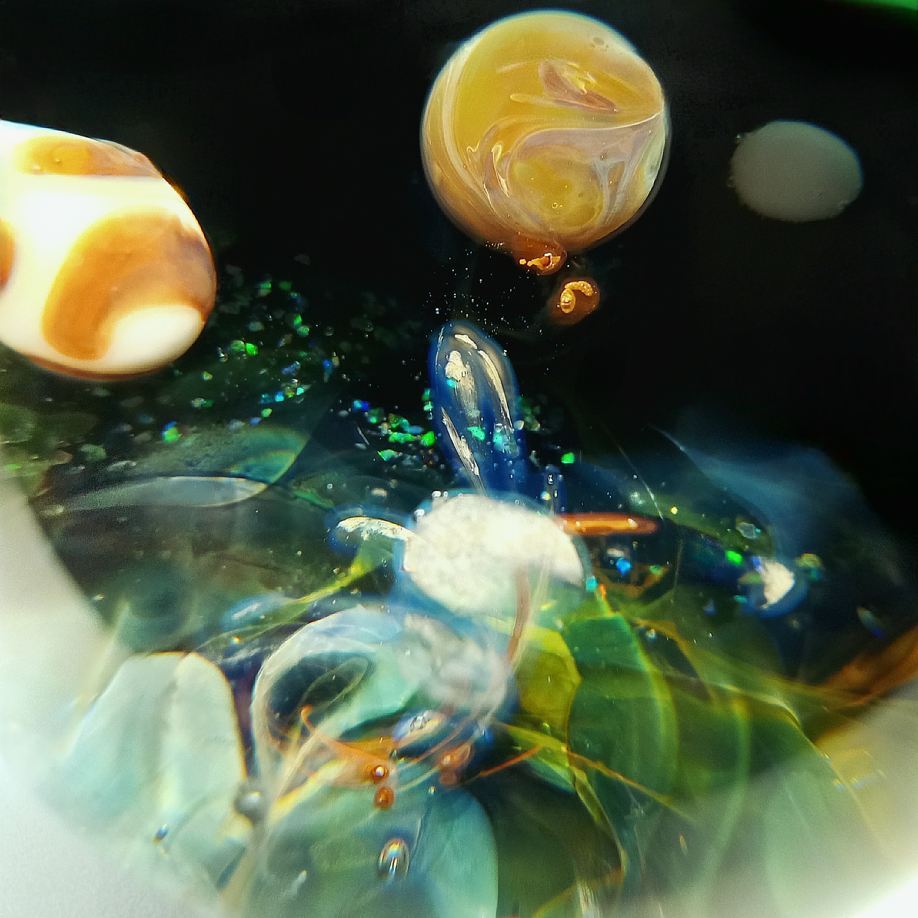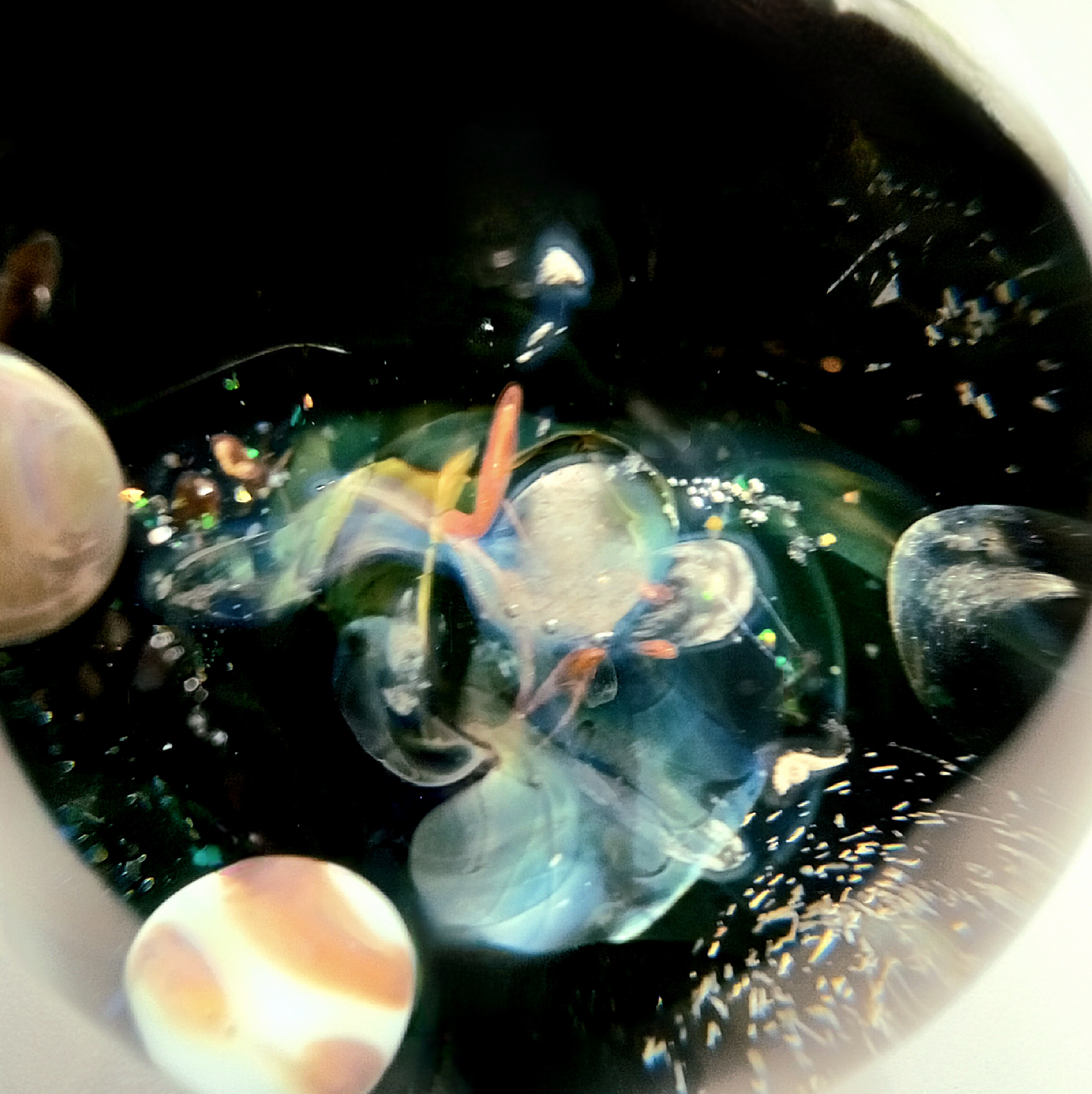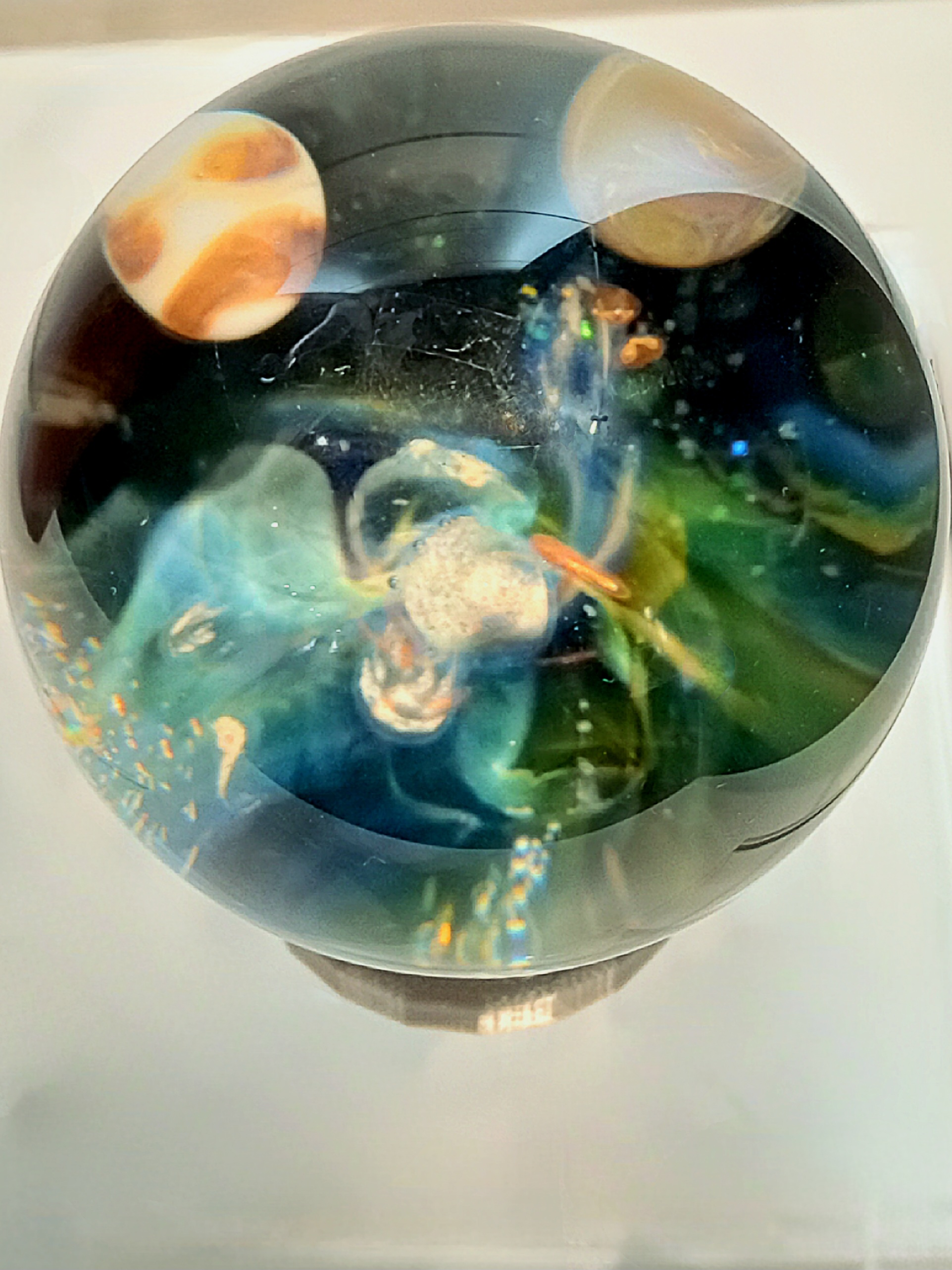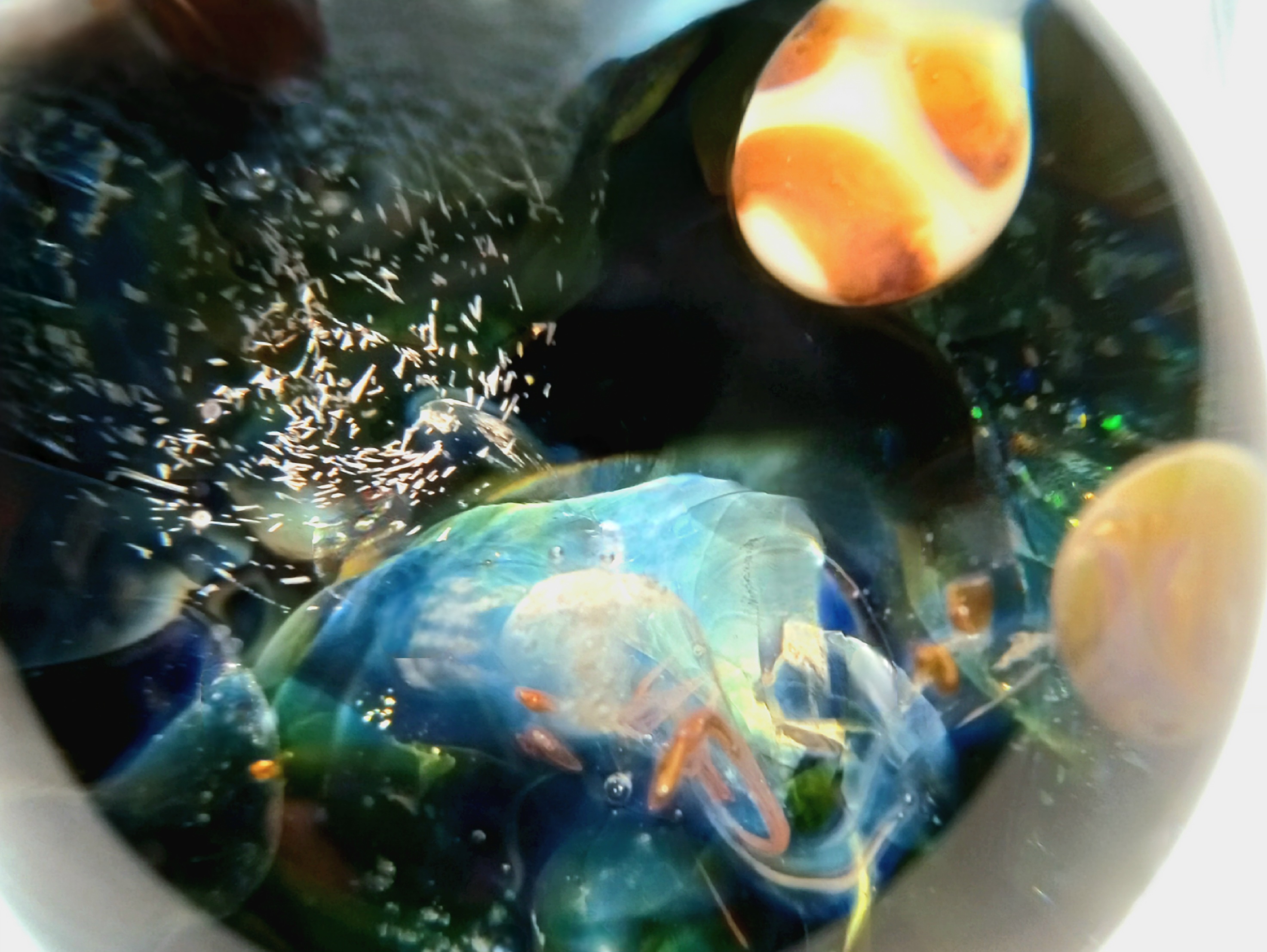 FUME COLLAPSE PLANET- ORB/ MARBLE by Rochester Glassblowing artist Seth Auger. He uses a variety of materials to create these beautiful, stunning orbs including pieces of glass and opals and others. Seth Auger has been a glass artist for 20 years. He fell in love with the process of melting glass to create art while in college. His work in our gallery include vases, marbles & ornaments.