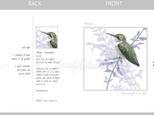 A poem on backside of note cards reads (note cards are blank inside): Soft light, a whisper of hope pauses in my garden, a quiet reminder that peace can yet be found