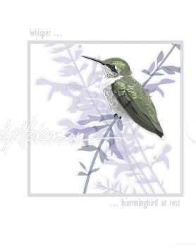 WHISPER... HUMMINGBIRD AT REST- a notecard done by Rochester artist Sandy Hokanson. In this original illustration by Sandy Hokanson, a young ruby-throated hummingbird is perched on a flower stalk. The white sky, soft lavender colored flowers and muted greens together create a stunning yet very peaceful scene.