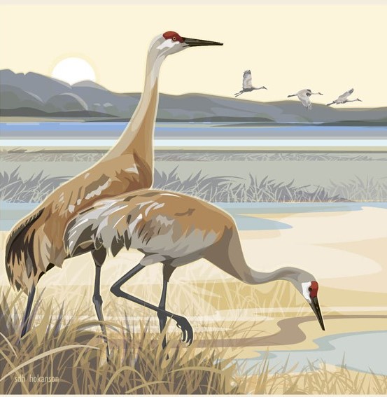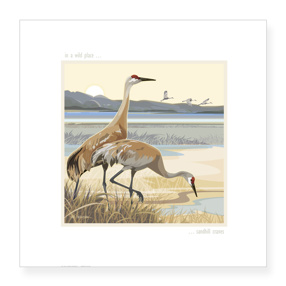 An original illustration titled "IN A WILD PLACE- SANDHILL CRANES" (12" x 12" Signed Print) by local artist Sandy Hokanson. This image is also available as a note card, a 12" x 12" framed print, or a 16" x 16" metal print. In this illustration a pair of Sandhill Cranes stride across an early spring marsh at daybreak. Three more cranes glide in to join the larger flock just out of view. You can almost hear the honks, bugles and trills as the marsh wakes up and the day begins.