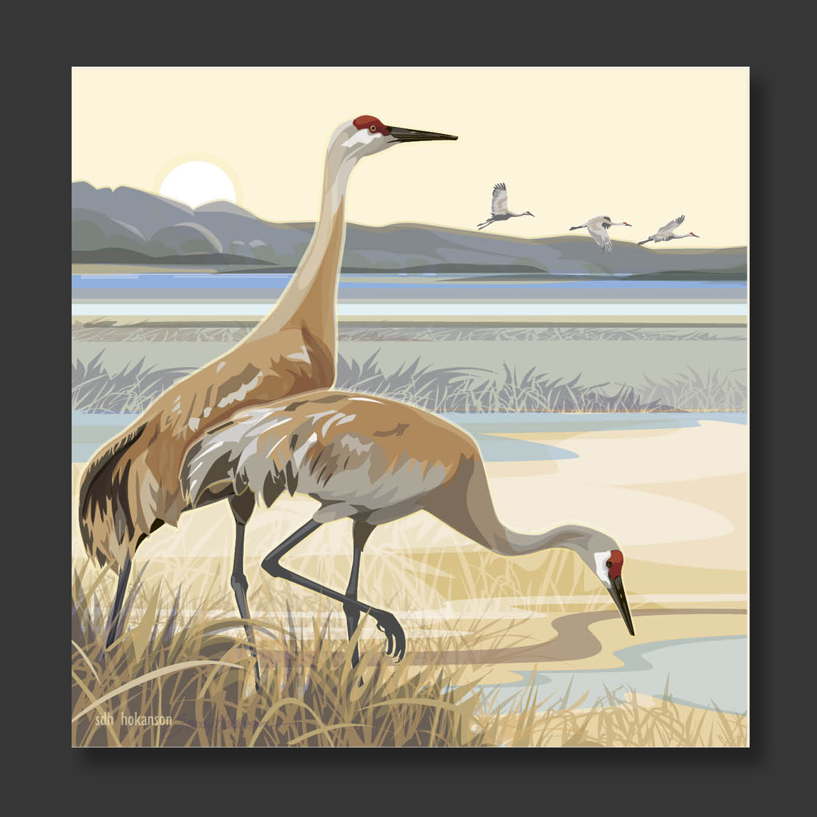 An original illustration titled "IN A WILD PLACE- SANDHILL CRANES" (16" x 16" Metal Print) by local artist Sandy Hokanson. In this illustration a pair of Sandhill Cranes stride across an early spring marsh at daybreak. Three more cranes glide in to join the larger flock just out of view. You can almost hear the honks, bugles and trills as the marsh wakes up and the day begins. This image is available as a note card, a signed 12" x 12" shrink wrapped print, a signed / framed 12" x 12" print.