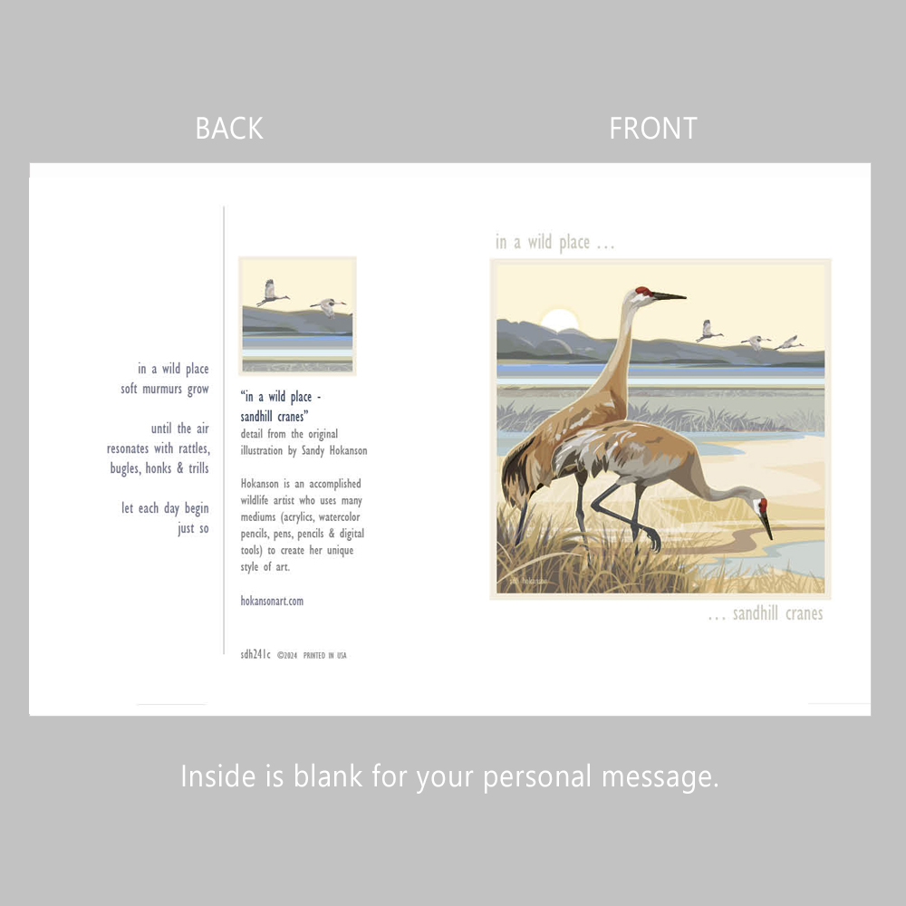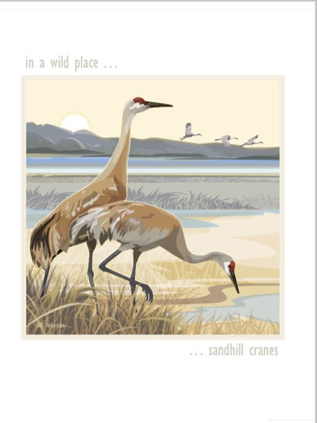 An original illustration titled "IN A WILD PLACE- SANDHILL CRANES" (Note Card) by local artist Sandy Hokanson. In this illustration a pair of Sandhill Cranes stride across an early spring marsh at daybreak. Three more cranes glide in to join the larger flock just out of view. You can almost hear the honks, bugles and trills as the marsh wakes up and the day begins. This image is available as a signed 12" x 12" shrink wrapped print, a signed / framed 12" x 12" print or a 16" x 16" signed metal print.