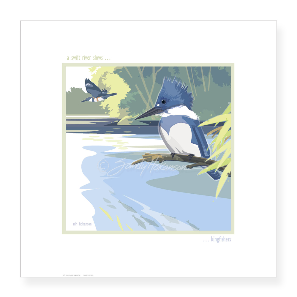 12" x 12" SIGNED PRINT: In this original illustration titled "A SWIFT RIVER SLOWS... KINGFISHER" by Sandy Hokanson, a male Kingfisher perches in the willows above a backwater pool. His mate flies off downriver, but the male waits patiently - he knows there are fish to be had in this spot. This image is available as a note card, a 12" x 12" shrink wrapped print (or framed) or a 16" x 16" signed metal print.