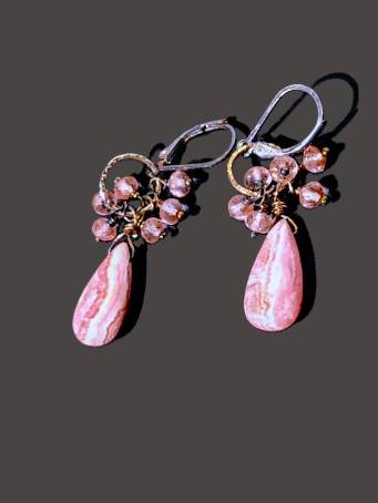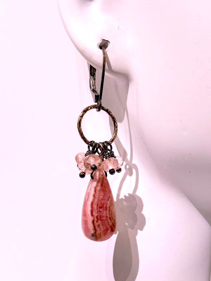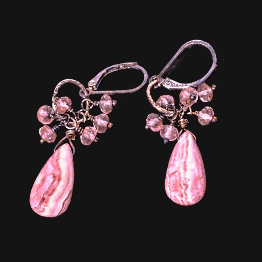 Oxidized Sterling Silver, long smooth flat Rhodocrosite teardrops, faceted round Rose Quartz accent beads (6/earring)-Earrings