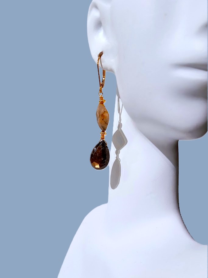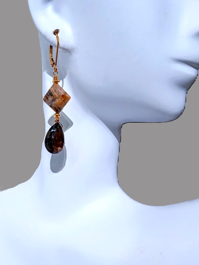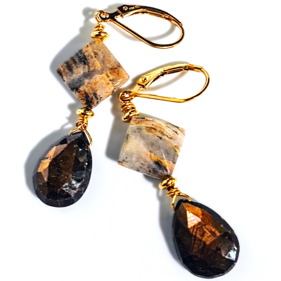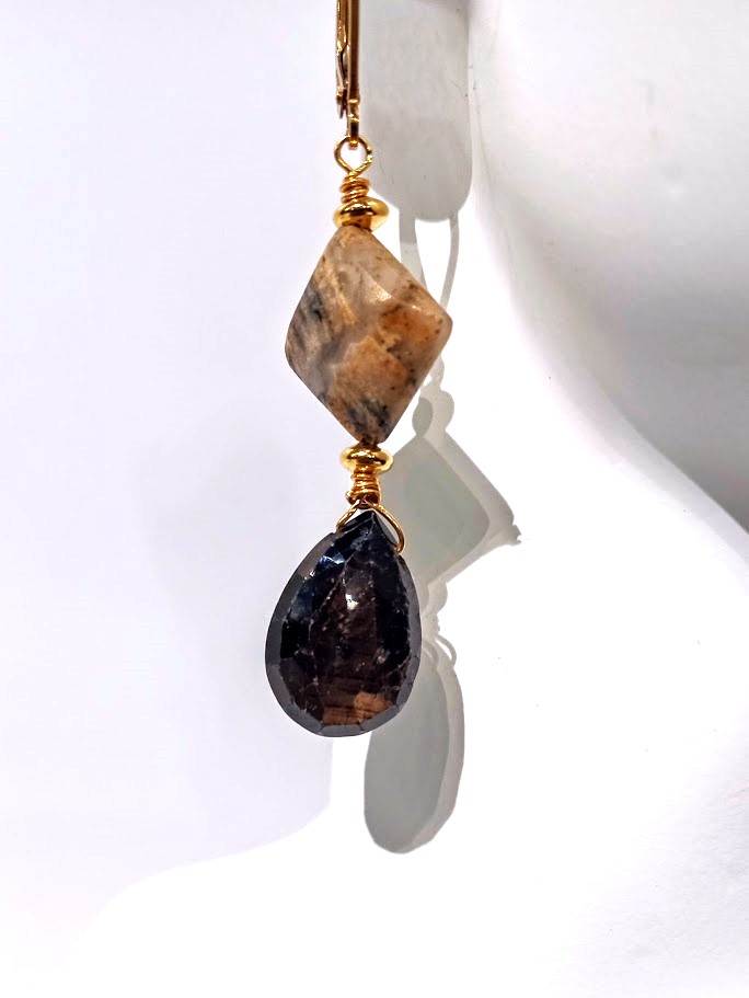 Goldfill Leverback Earwires, flat faceted diamond-shaped Jasper beads, flat faceted teardrop Brown Sapphire beads-Earrings