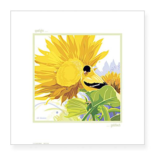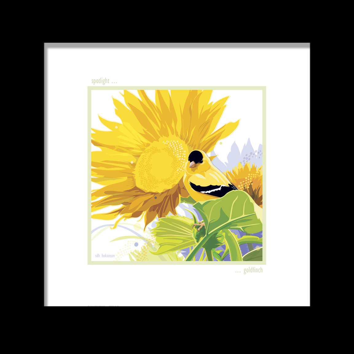 In this original illustration titled "Spotlight - Goldfinch" by local artist Sandy Hokanson, a brilliant male American Goldfinch looks out from his perch in front of a golden yellow sunflower in full bloom. This image is available as a note card, a signed 12" x 12" shrink-wrapped print or as a 16" x 16" signed metal print.