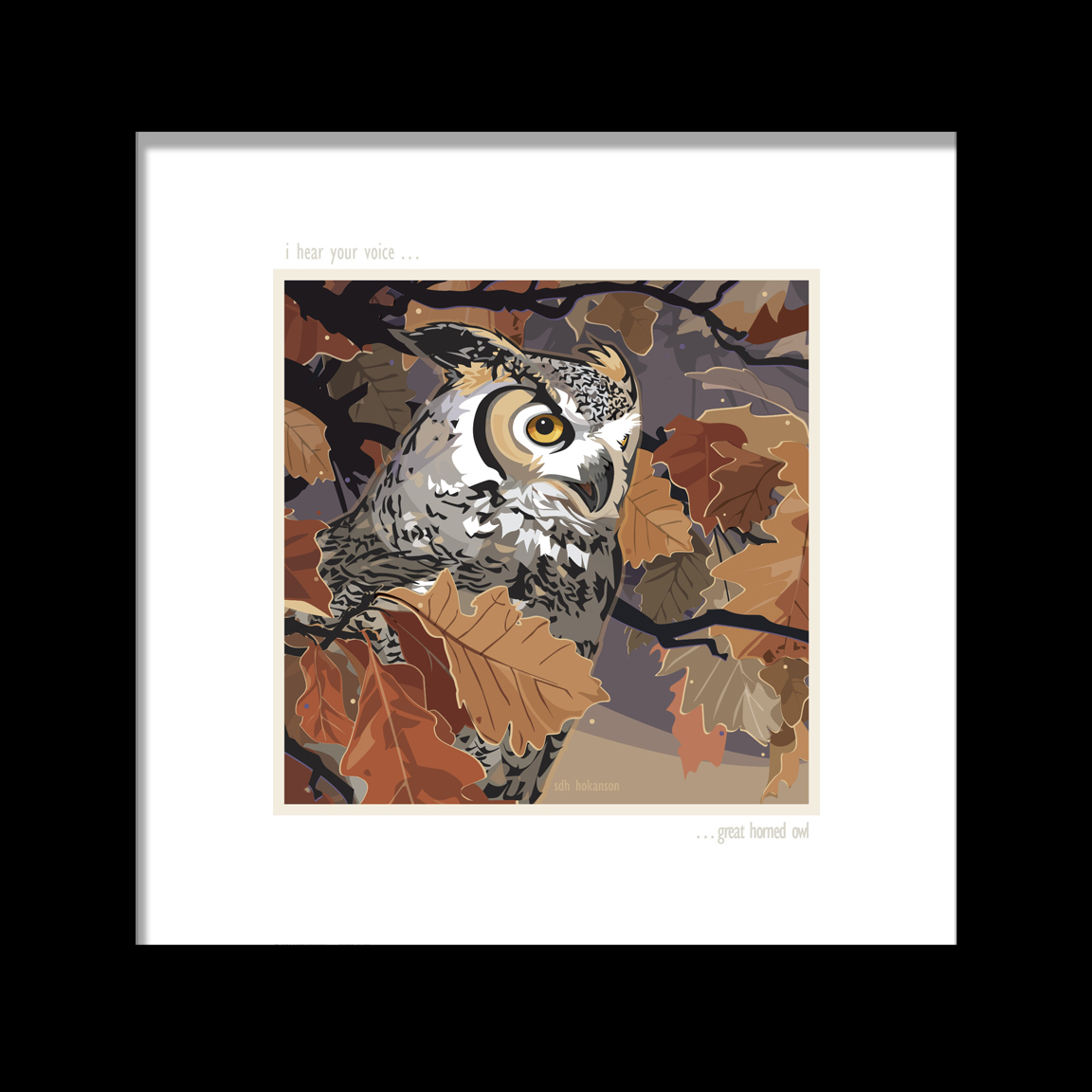 In this original illustration titled "I Hear Your Voice - Great Horned Owl" by Sandy Hokanson, a Great Horned Owl looks out from his perch amid richly colored oak leaves. Daylight is fading, night descending. She's heard the call of her mate and is about to answer. This image is available as a note card, a signed 12" x 12", or a signed 16" x 16" metal print.