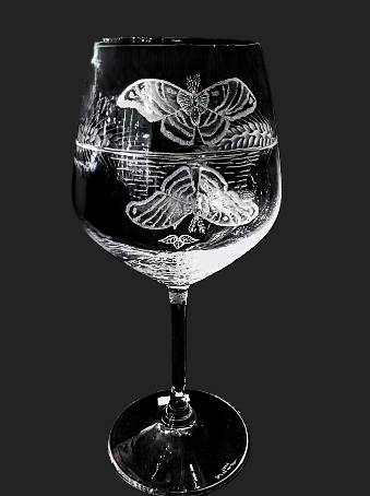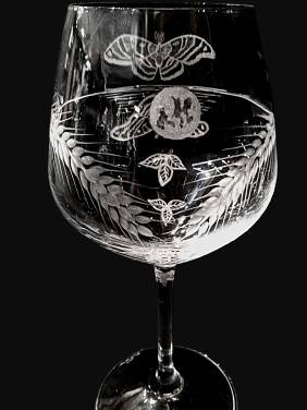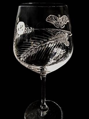 A stunning cut Wine Glass with wheat plants wrapped around the glass as well as a moth and its reflection in the water. Including the moon high in the sky- by our local, very talented cut-glass artist, Carl Miller.