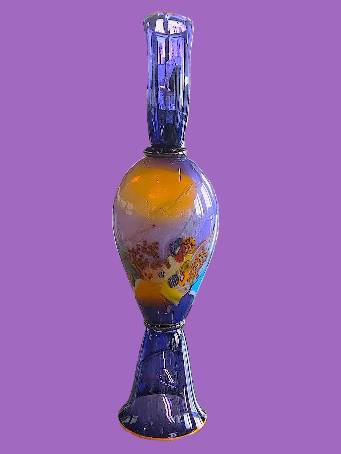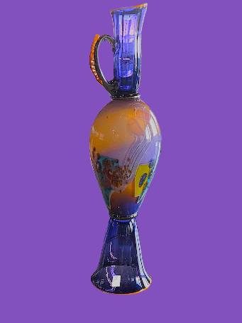 A COLORFIELD AMPHORA VASE- This bright Colorfield Vessel is like a drawing on glass. The intense colors and the millefiori patterns on the piece are each unique and different on both sides of the vessel, with multi-colors including mostly bright and neon colors that are "drawn" by Rural Wisconsin Glassblower Wes Hunting. Wes Hunting has been working with glass for over thirty years. He is known for his incredible skill with cane and murrini as well as remarkably intricate, abstract patterns drawn on hot glass. These vessels are the first to dawn the Colorfield imagery. The title “colorfield” refers to the intense color and patterns which Wes “draws” onto the glass surface at temperatures exceeding 1,600 degrees. Much of Wes’s artistic style is his masterful rendering of the Italian glasswork technique called “millefiori”, which translates to a thousand flowers. The slim profile allows them to sit comfortably atop any narrow shelf or mantle. When placed in proximity of natural light, the complimentary color combinations may lightly shift along with the daylight. Each is unique and will vary slightly.
