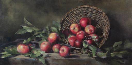 PATRICIA RILEY: Wicker and Apples (OIL PAINTING 15 in X 30 in)
