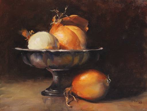 PATRICIA RILEY: Tarnished Silver and Onions (OIL PAINTING 11 in X 14 in)
