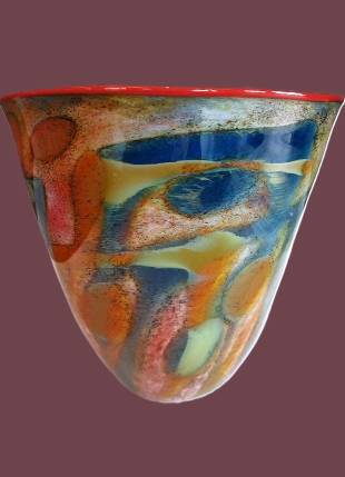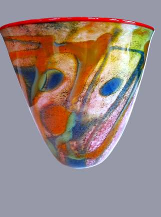BOWL RED INT. BLUE/RUBY/AMBER/GREEN- handcrafted by local Glassblower Robinson Scott, from Anoka, Minnesota. He has been blowing glass for over 45 years. His stunning artwork has earned him many awards through his glassblowing career. “I am always influenced by the importance of simplistic designs that enhance and accentuate the depth, reflectivity and translucency that naturally occur in glass. The predictability and unpredictability of glass creates an atmosphere of discovery, learning and continual growth. This is what motivates me to further test, expand and explore my abilities.”- Robinson Scott.