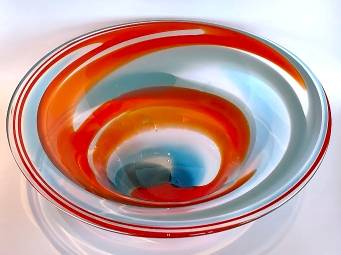 OPEN BOWL TWISTED COLOR RED/TURQUOISE- handcrafted by local Glassblower Robinson Scott, from Anoka, Minnesota. He has been blowing glass for over 45 years. His stunning artwork has earned him many awards through his glassblowing career. “I am always influenced by the importance of simplistic designs that enhance and accentuate the depth, reflectivity and translucency that naturally occur in glass. The predictability and unpredictability of glass creates an atmosphere of discovery, learning and continual growth. This is what motivates me to further test, expand and explore my abilities.”- Robinson Scott.