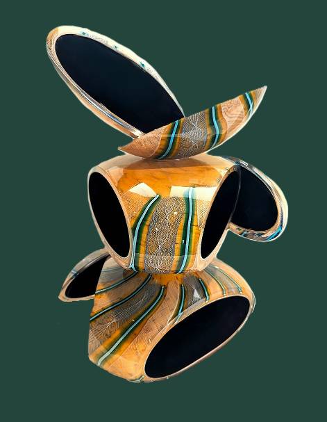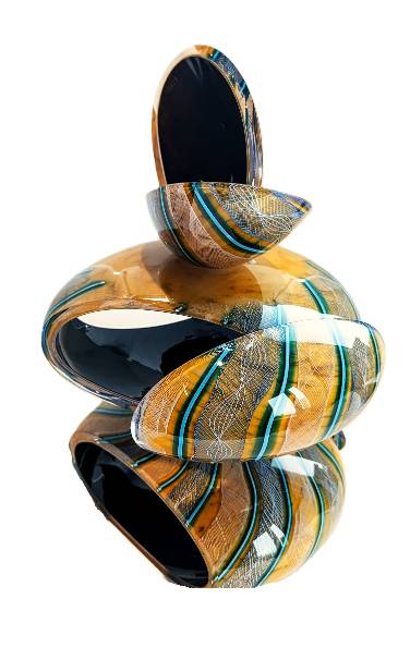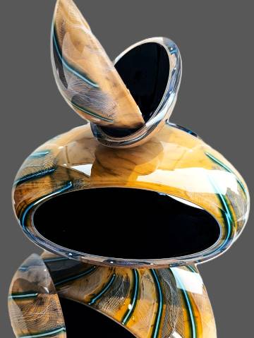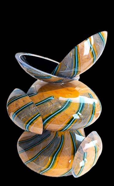 AN OPAQUE REMNANT-This piece has mulitple colors. "The Remnant Vessel series is comprised of bright and vibrant glass sculptures. He first produces two oval or "disk-shaped" vessels with his custom color designs on the surface. After the pieces have cooled from the blowing process, he cuts sections away from the vessels and cold polishes every new surface to an optically pure finish. He then assembles the pieces into the final form using a permanent, ultraviolet laminate."- (ARTFUL HOME QUOTE)