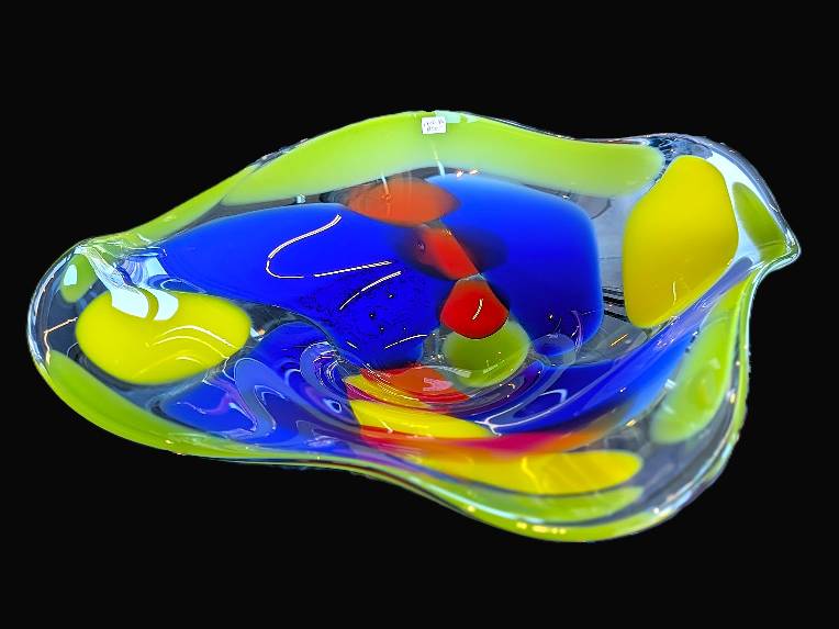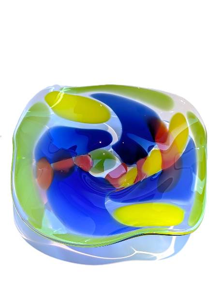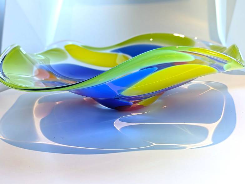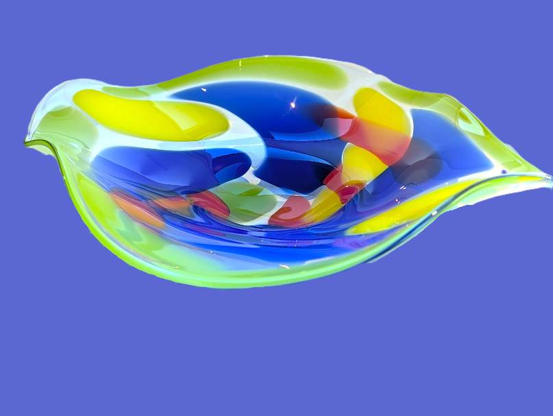WAVY BOWL ORANGE/YELLOW/GREEN/BLUE - handcrafted by local Glassblower Robinson Scott, from Anoka, Minnesota. He has been blowing glass for over 45 years. His stunning artwork has earned him many awards through his glassblowing career. “I am always influenced by the importance of simplistic designs that enhance and accentuate the depth, reflectivity and translucency that naturally occur in glass. The predictability and unpredictability of glass creates an atmosphere of discovery, learning and continual growth. This is what motivates me to further test, expand and explore my abilities.”- Robinson Scott.