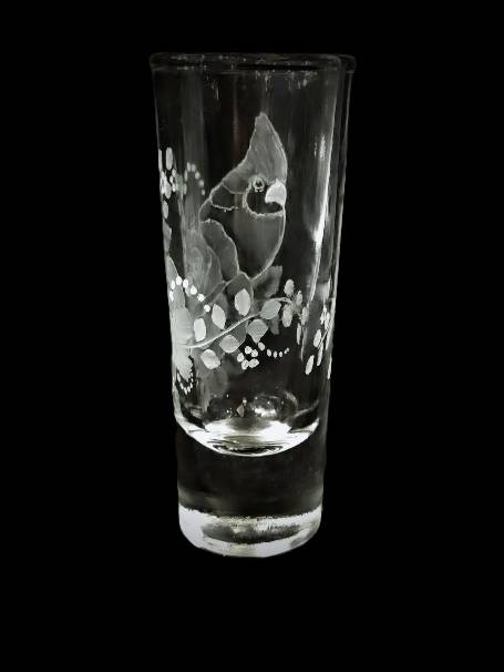 This ONE-OF-A KIND 2 OZ- CARDINAL & ROSES- CLEAR HEAVY-BOTTOM SHOT GLASS is done by our very talented local cut-glass artist, Carl Miller. This cardinal is cut and designed with rose plants wrapping around the other side of the glass